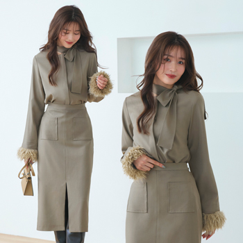 オーガンジースリーブタックフレアトップス&シークレットゴム・スリムテーパードパンツ(ボウタイ付き)「PA1322」 -