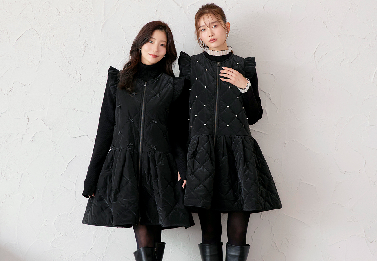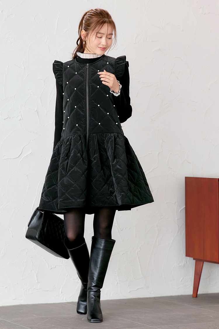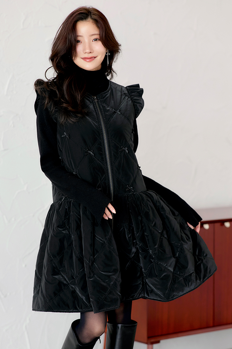 防寒だけじゃ物足りない〜オシャレしたい日に着るパフィ・ジレワンピース。発熱する機能性中綿だから、あたたかさと、着ぶくれないスマートなシルエットを実現。 春先まで着られる、軽いアウターに仕上げました。上品な艶感と煌めきをもったグロスタフタ素材 × 可愛らしい装飾でスペシャルな一着です。