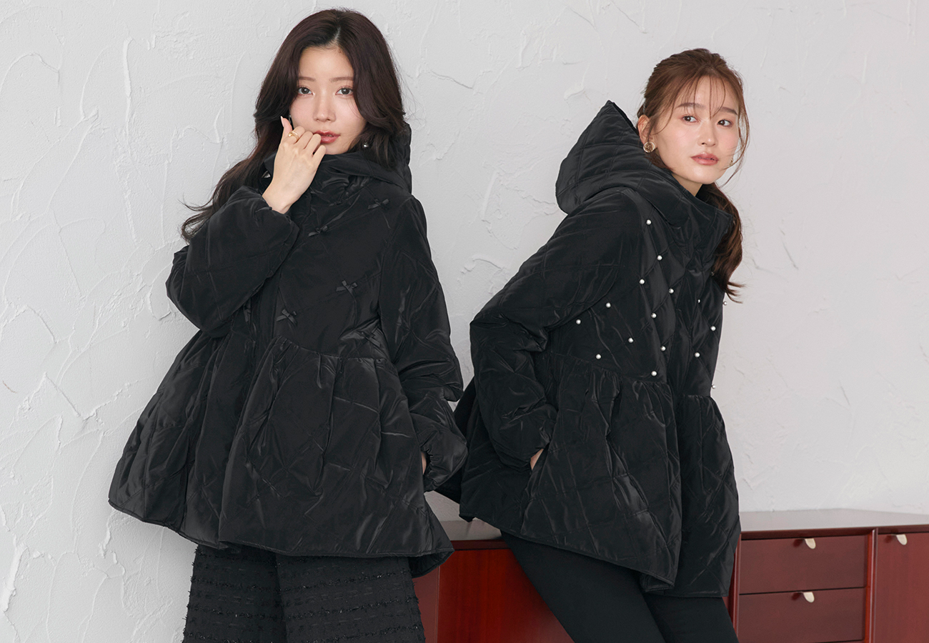 防寒だけじゃ物足りないオシャレしたい日に着るパフィ・フードコート。上品な艶感と煌めきをもったグロスタフタ素材×可愛らしい装飾でスペシャルな一着です。発熱する機能性中綿だから、あたたかさと着ぶくれしないスマートなシルエットを実現。