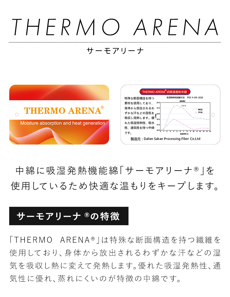 ハイテクな発熱ポリマーをポリエステルに練り込んでいるため、吸収された赤外線を熱エネルギーに変換と同時に、人体による遠赤外線を反射する効果も有り、優れた保温効果を持っています。