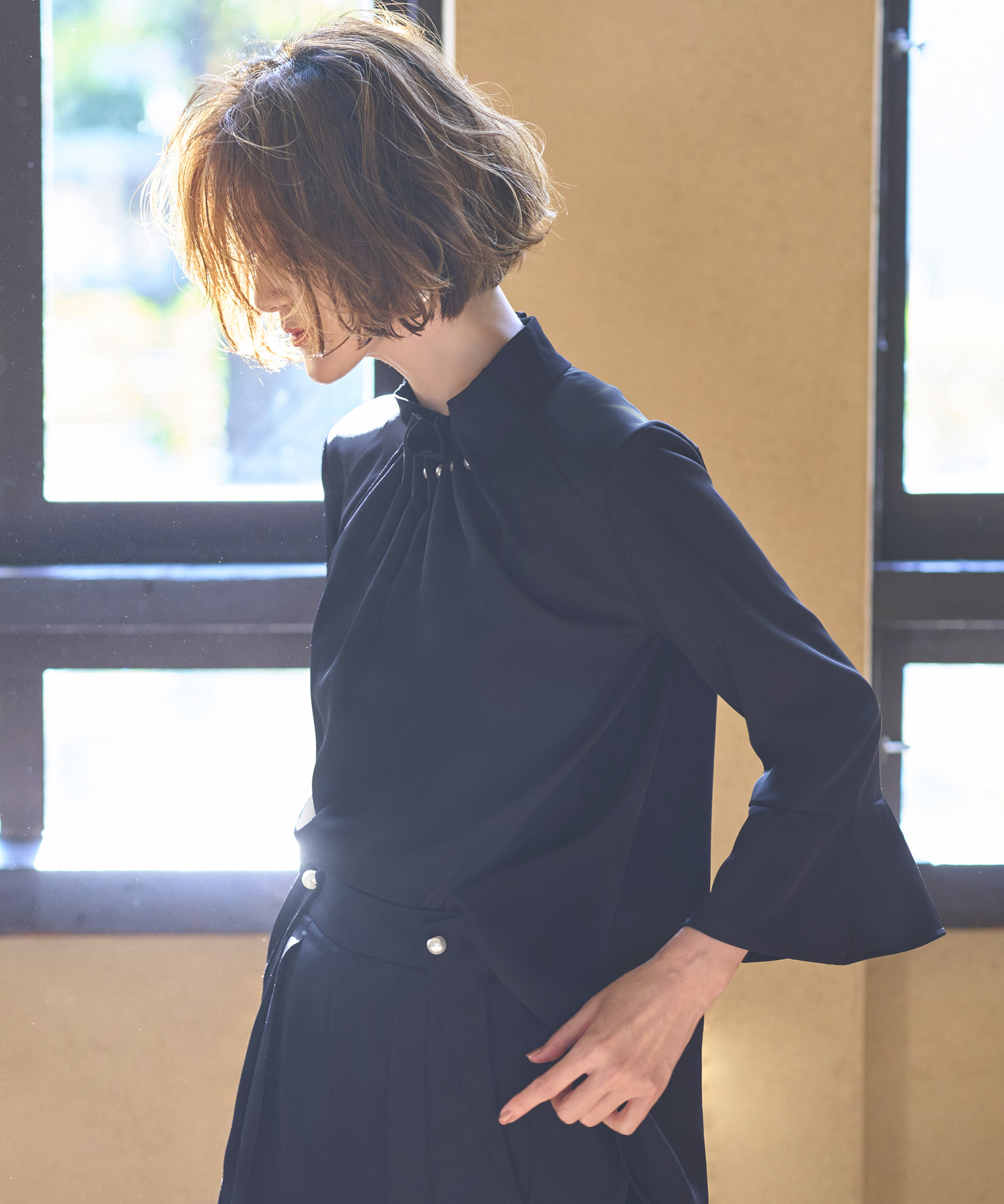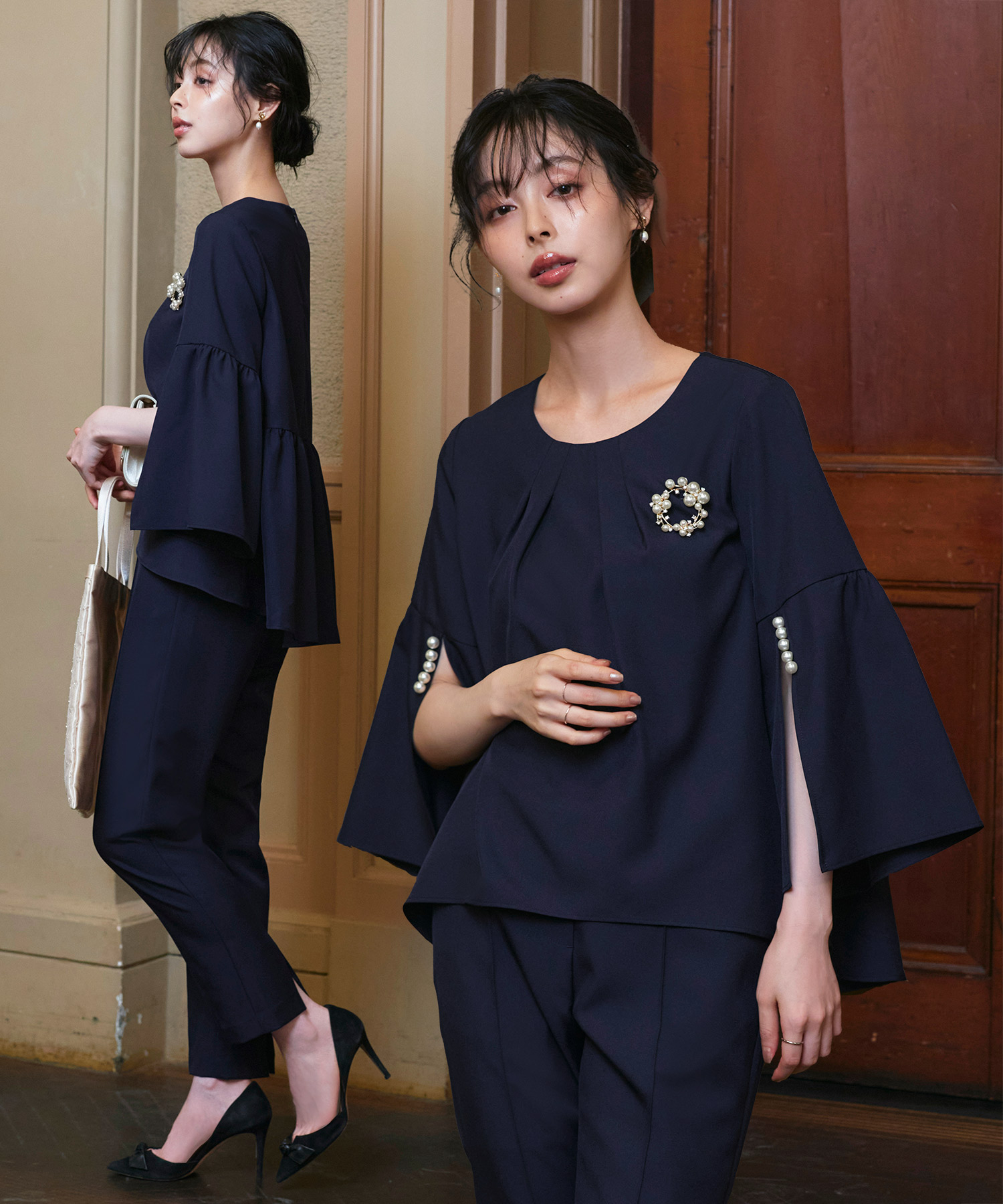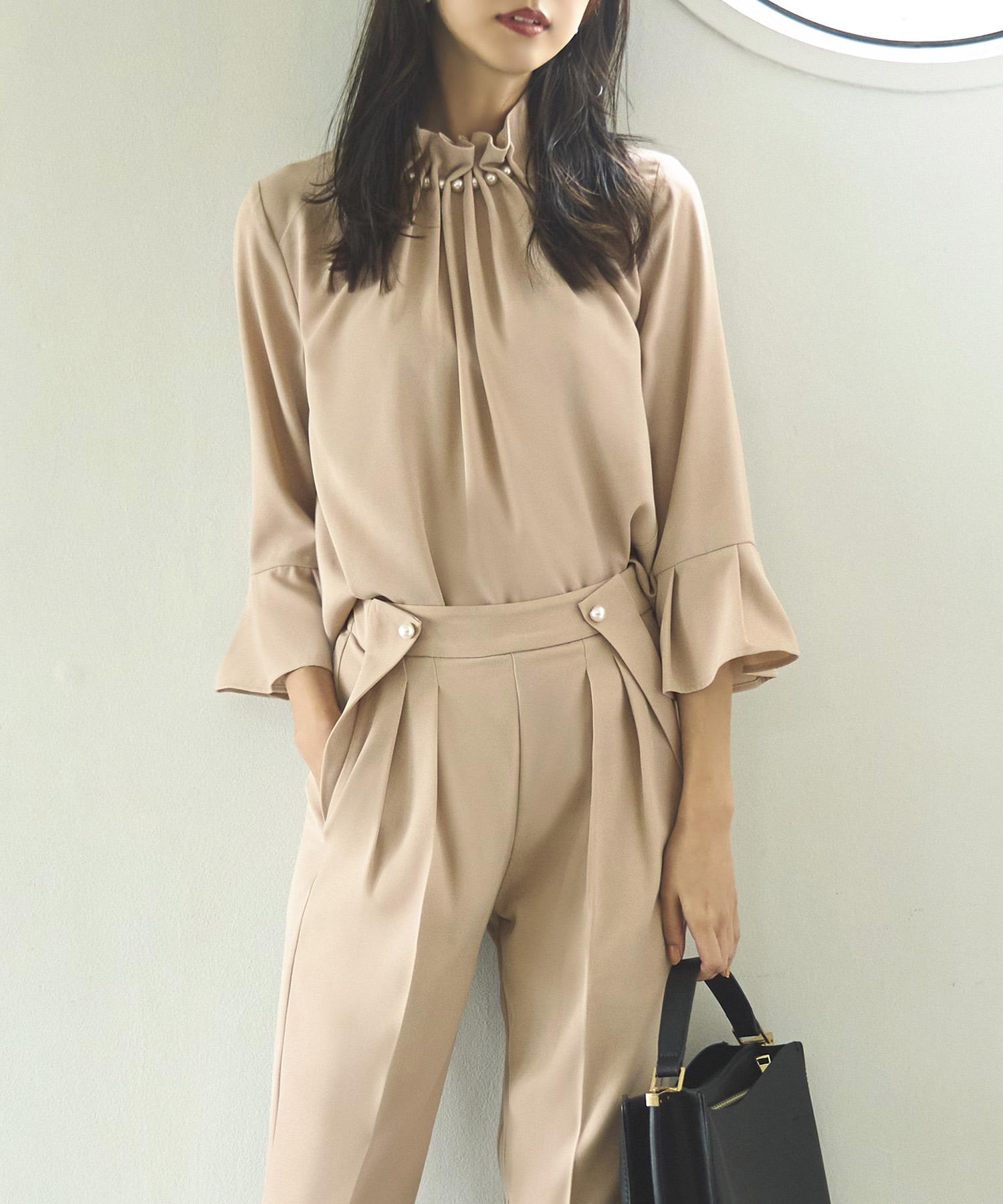 パールをあしらった首元と袖口のフレアがエレガントな印象のブラウスとポケット部分に、パールを配したテーパードパンツのセットアップ。 首元のパールが華やかなのでアクセサリー要らずです。トップスの前をINして、パンツのパールを覗かせるスタイルがおすすめ。