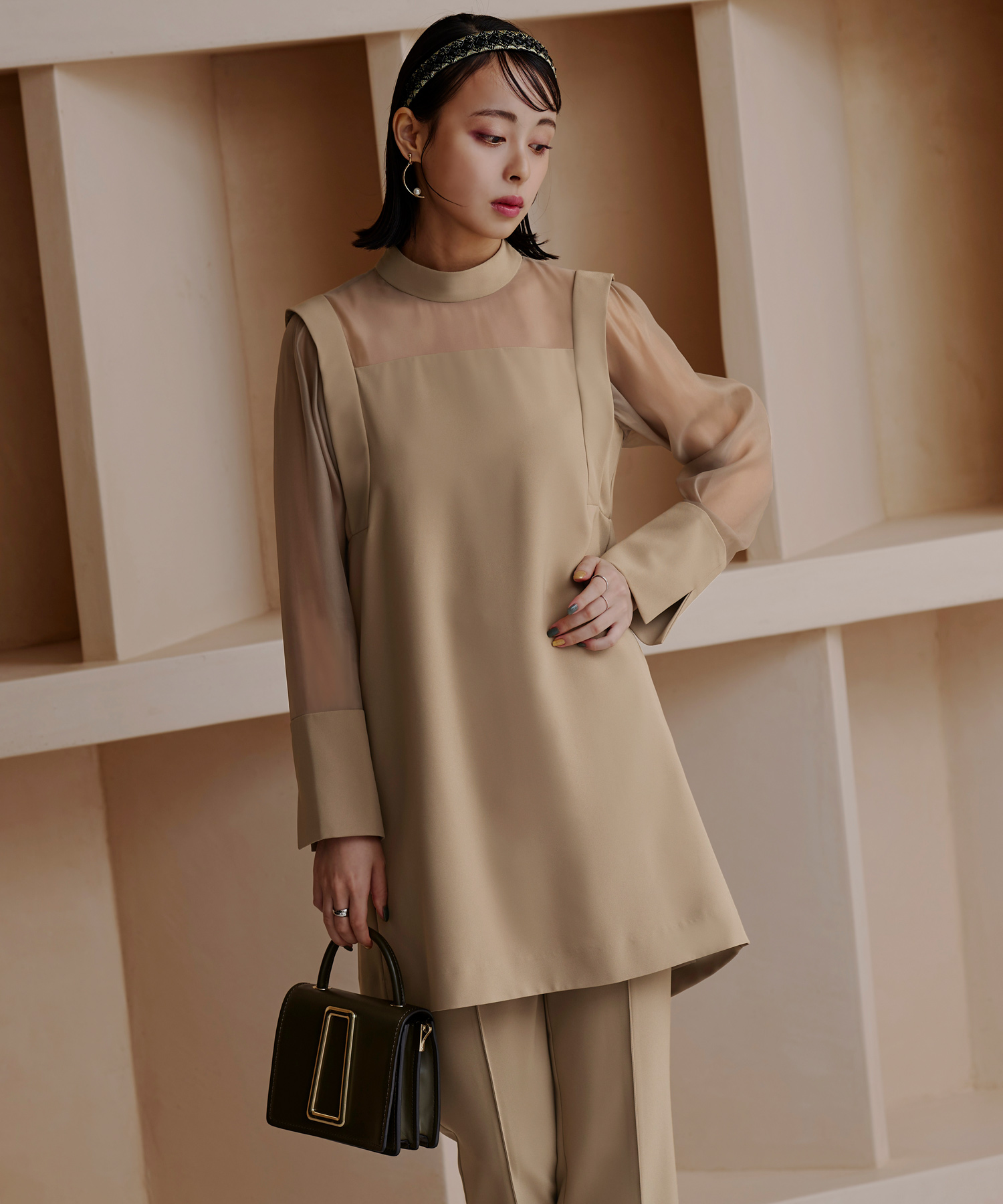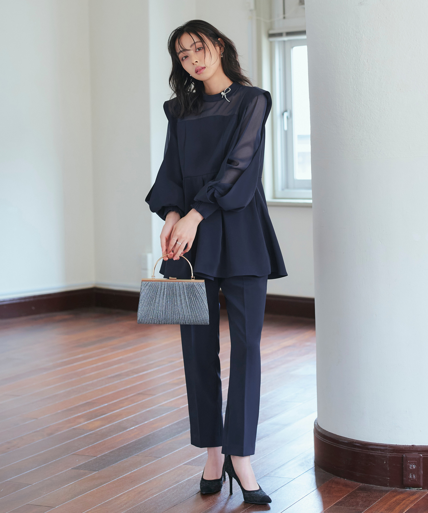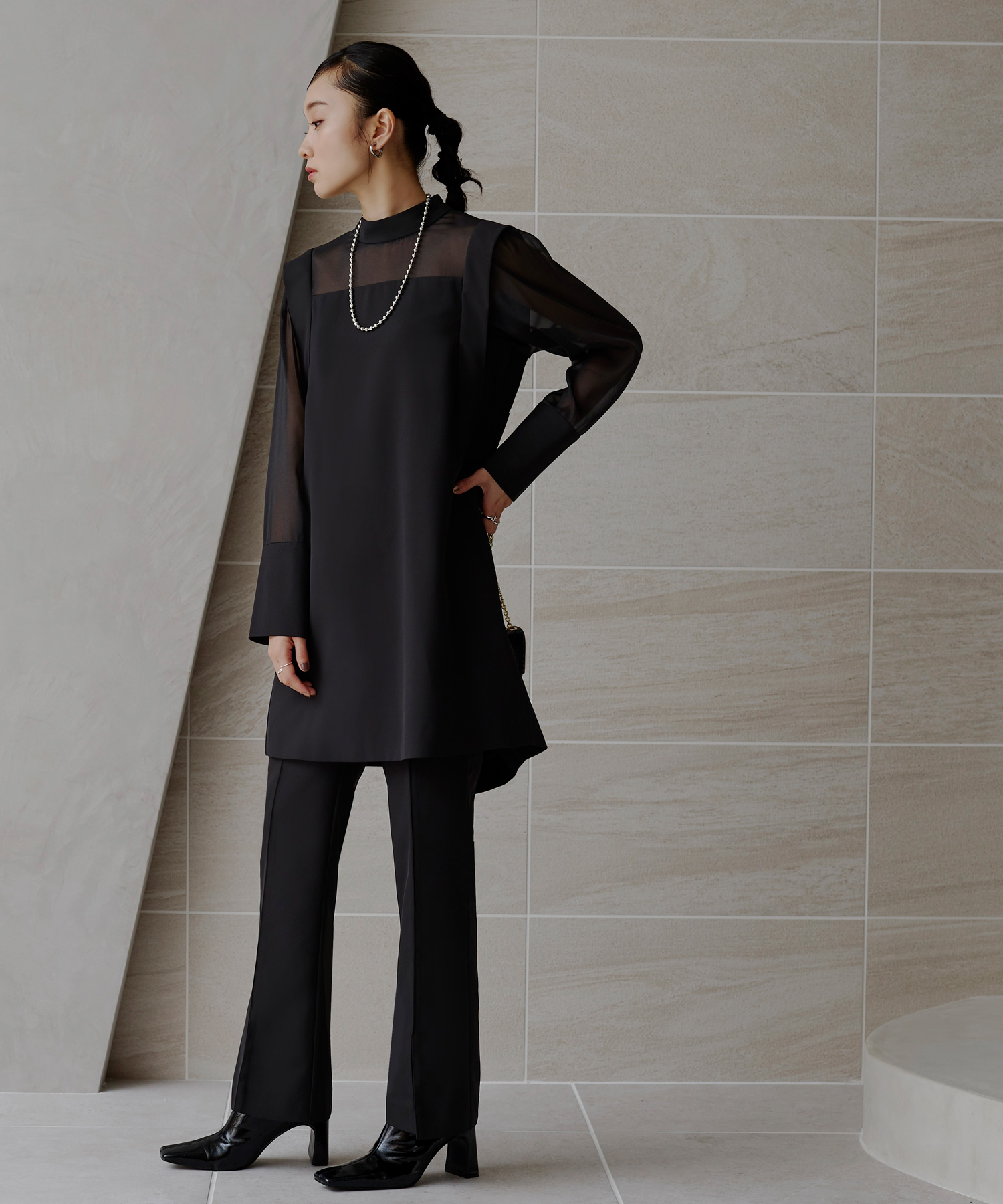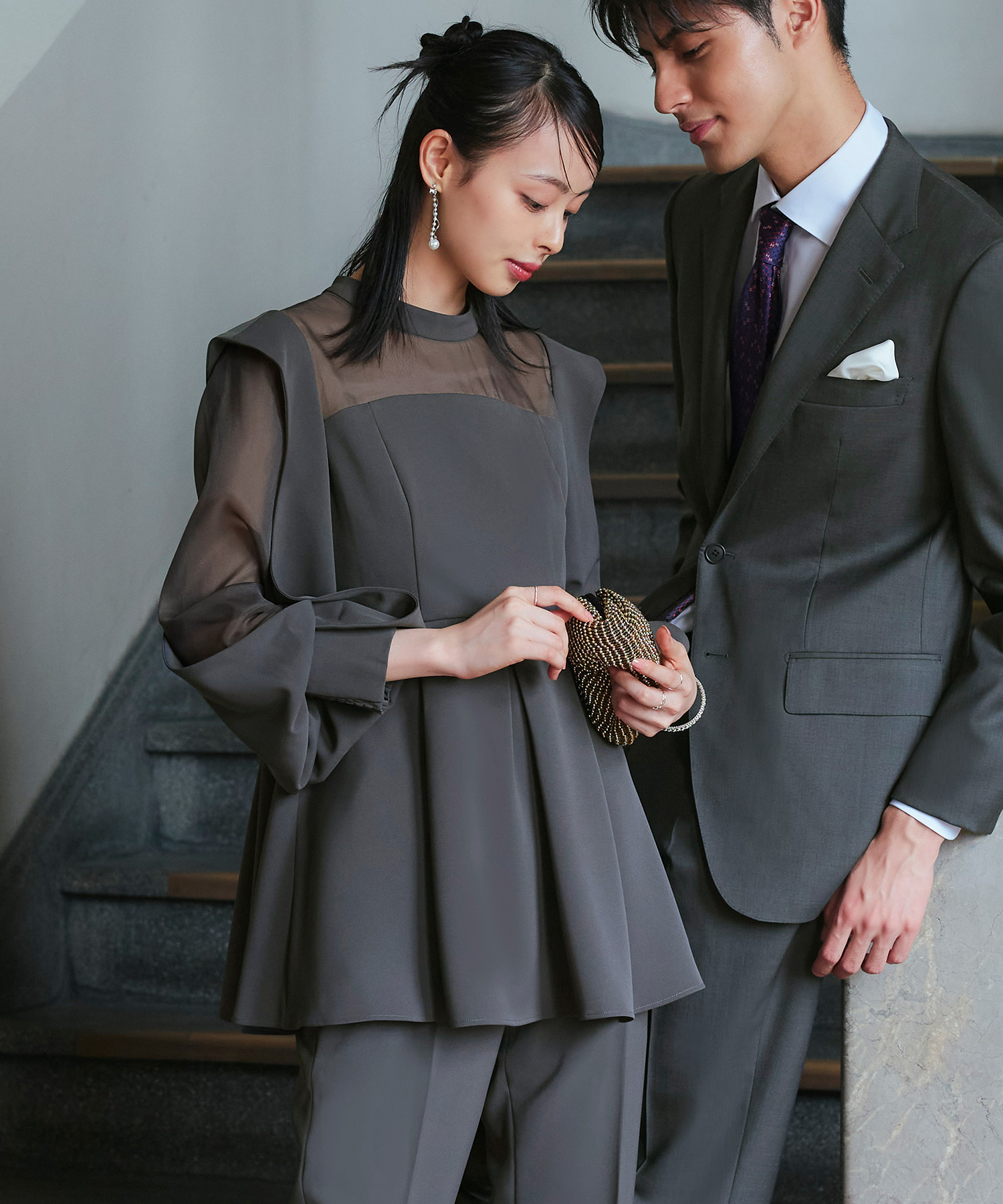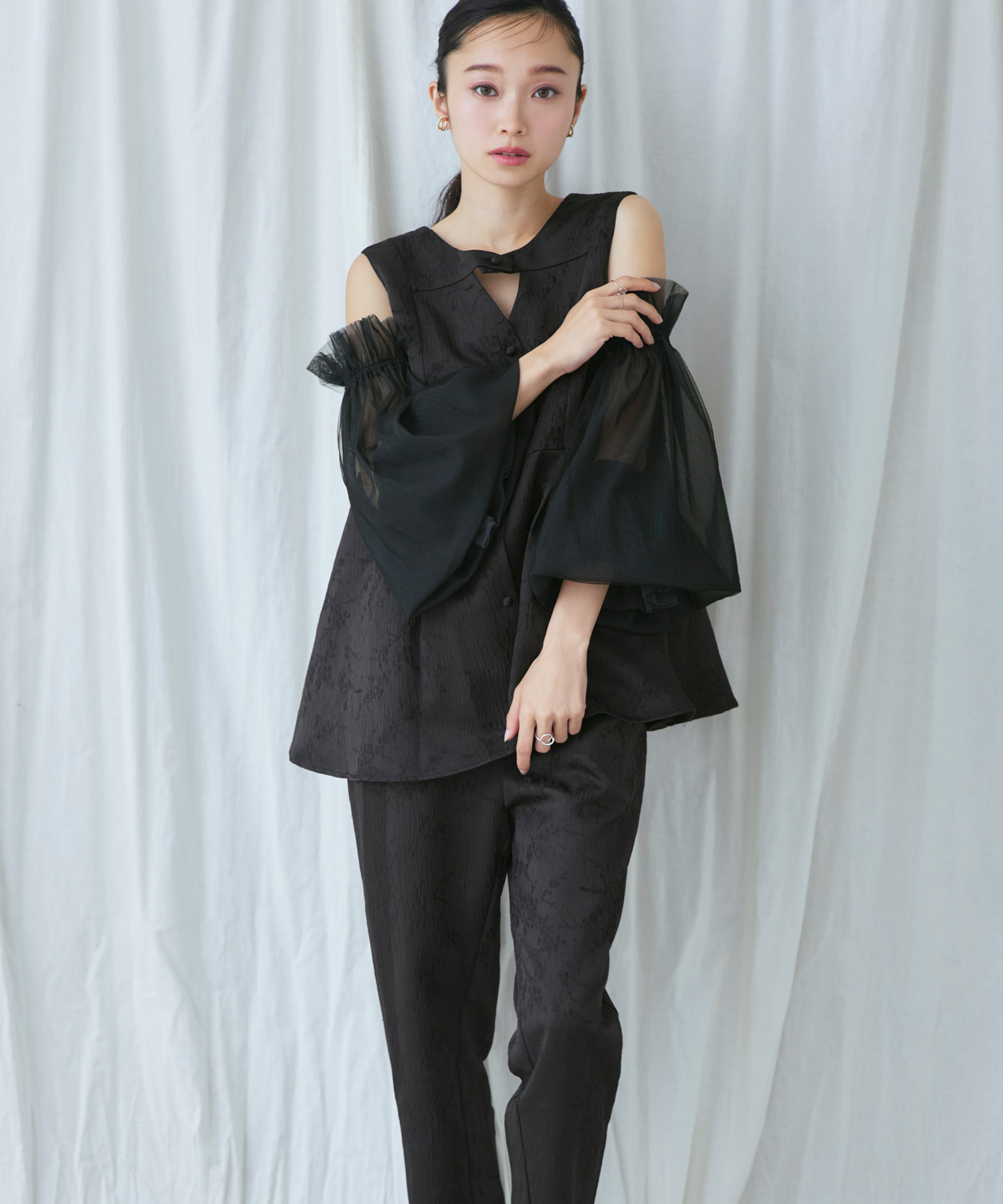 素材コンビネーションが叶える奥行き豊かなパンツセットアップ、ディテールコンシャスなオーガンジースリーブで軽やかに。気負いなく着用出来る、長めの着丈とゆったりシルエットも嬉しい。式典などのフォーマルシーンにもおすすめです。