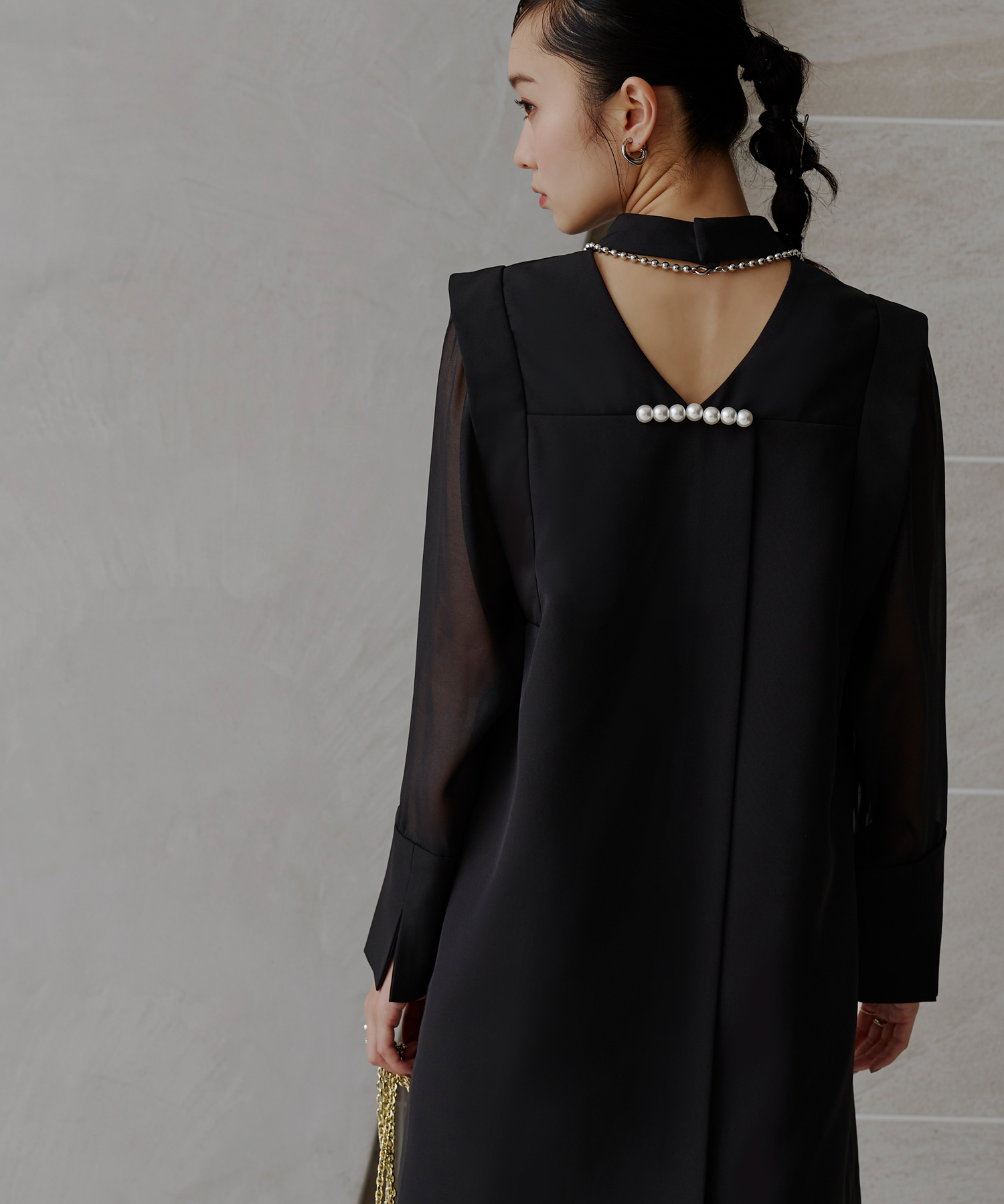 デコルテから袖は適度な透け感があり、重たくならず抜け感を演出。首まわりにはパール装飾付きで、一層華やかに。