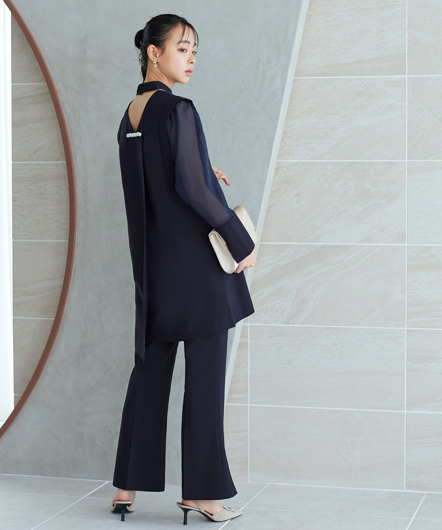 Iラインシルエットがモードなセットアップ、フレアパンツ+トップスの2点セット。バックのV開きとパールが目を惹く印象的なデザイン。