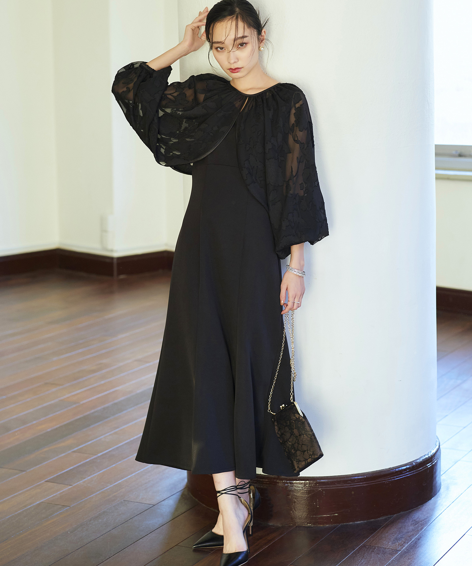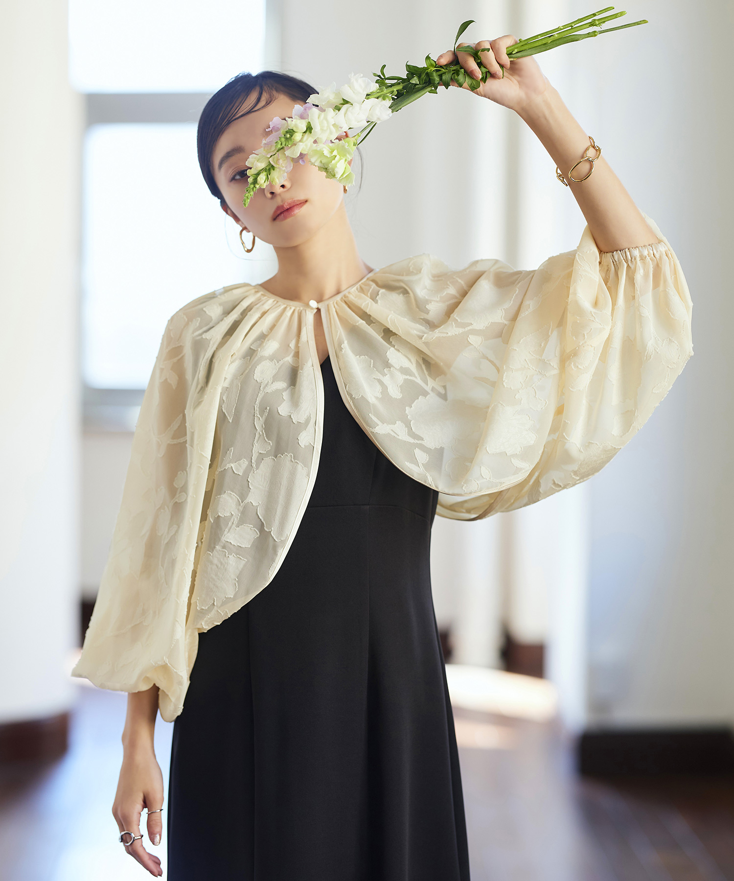 上品なマーメイドシルエットのドレスと透け感のあるジャカードボレロがセットになった、オケージョンドレス。袖のふんわりとしたシルエットがかわいいボレロは、前後着用可能。それぞれ単品でも使える万能アイテム。