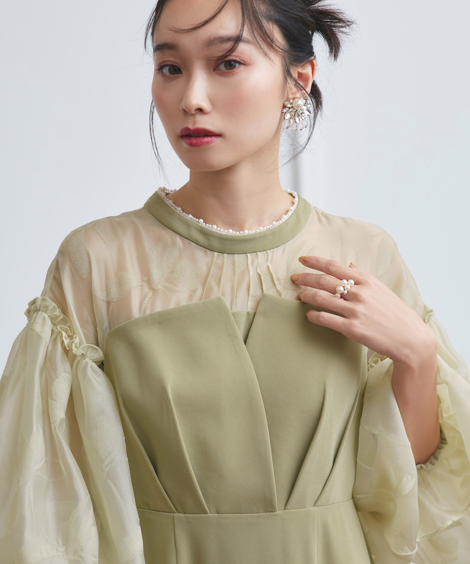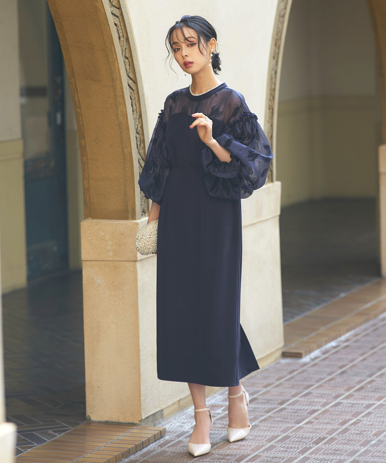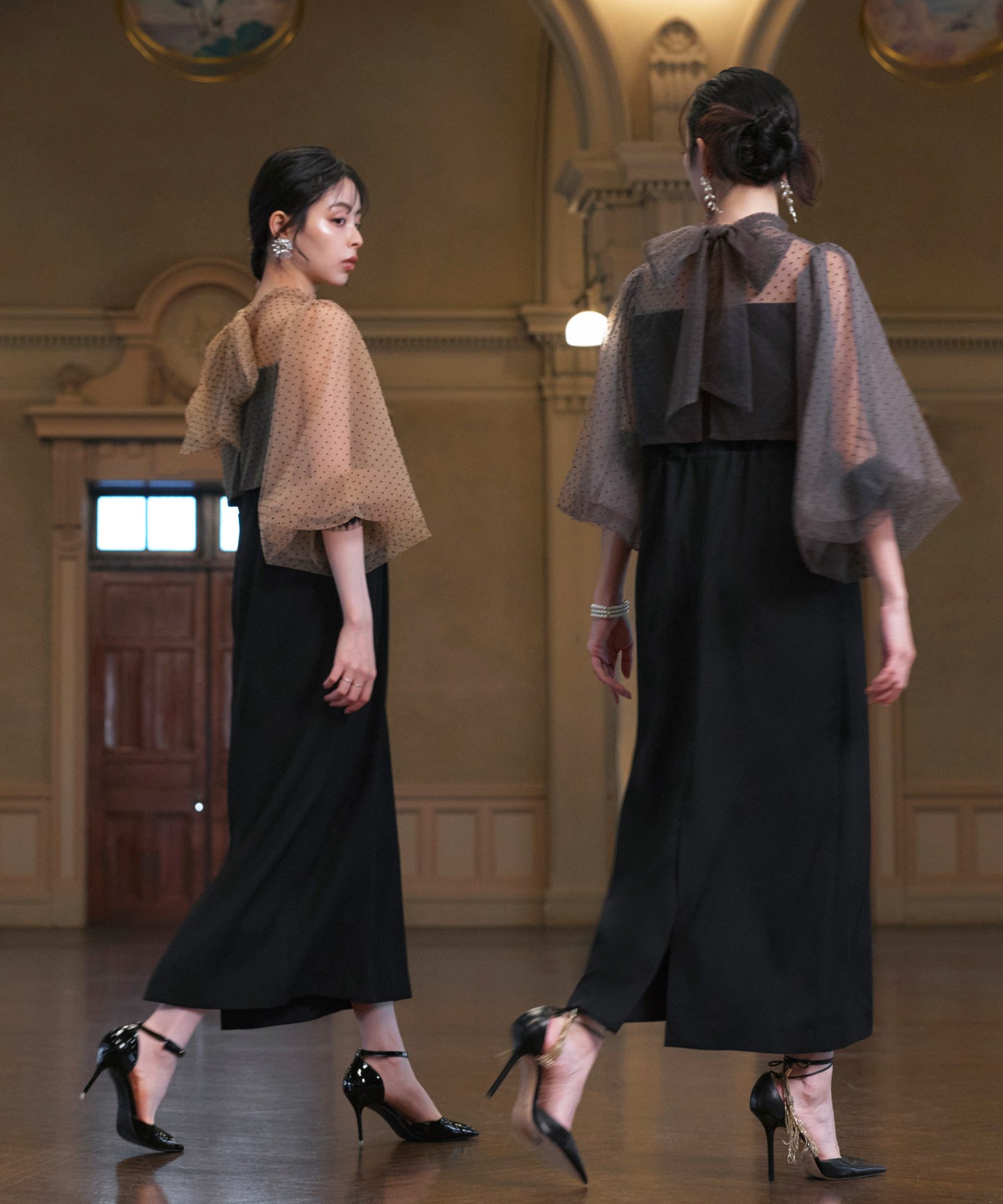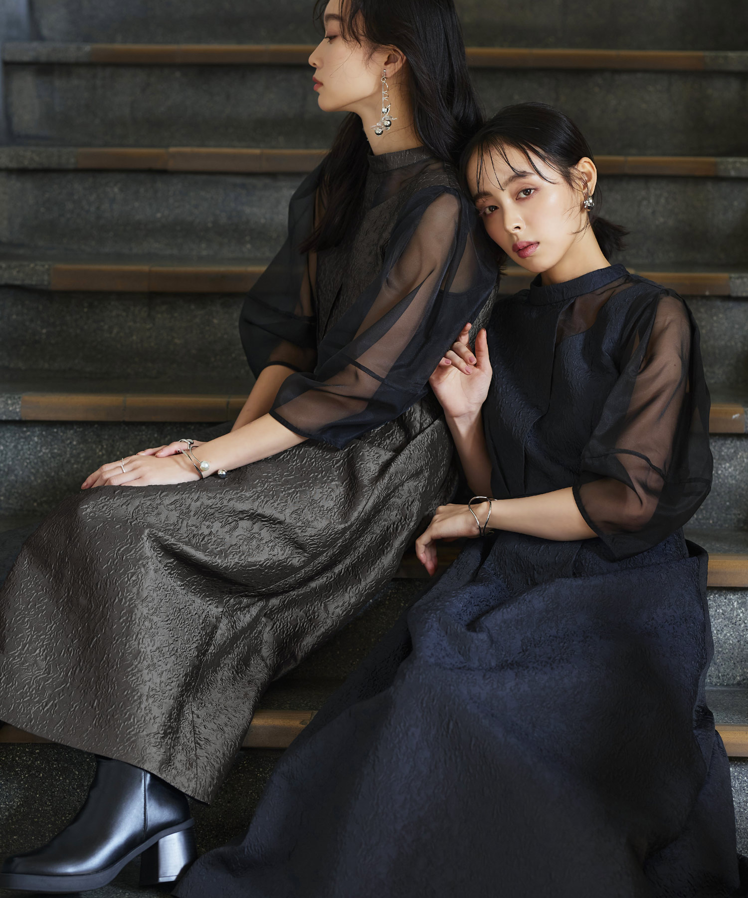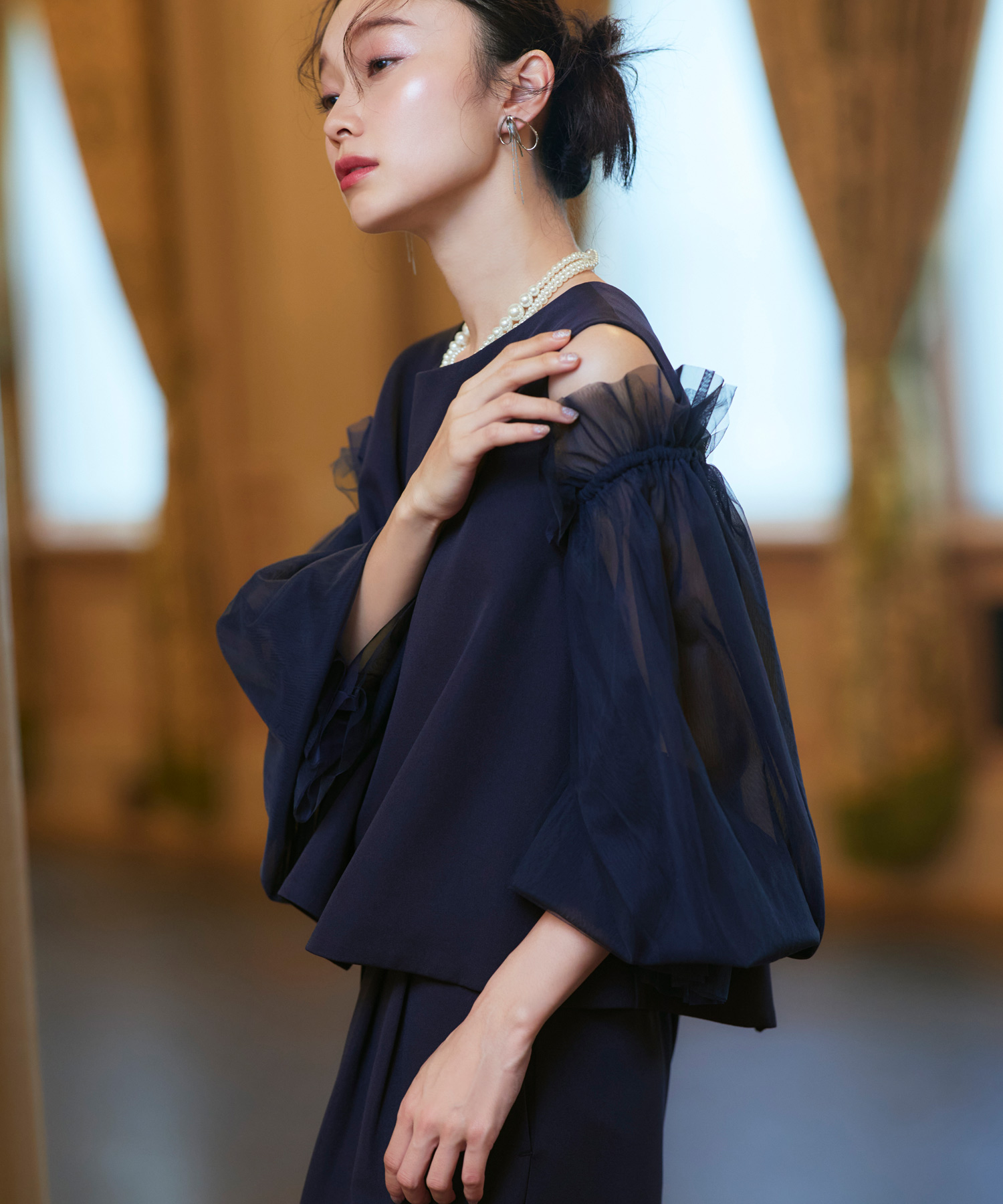 透け感と袖の立体感が映える上品なセットアップドレス。トップスの程よい透け感とボリュームスリーブが優雅な印象を与え、ドレスのしなやかなシルエットが女性らしさを引き立ててくれます。