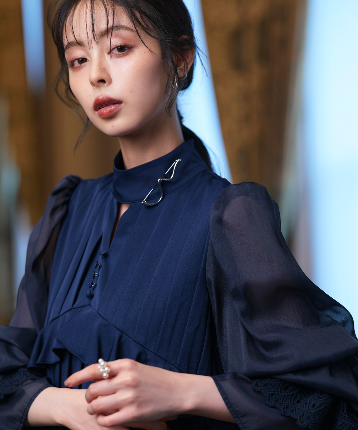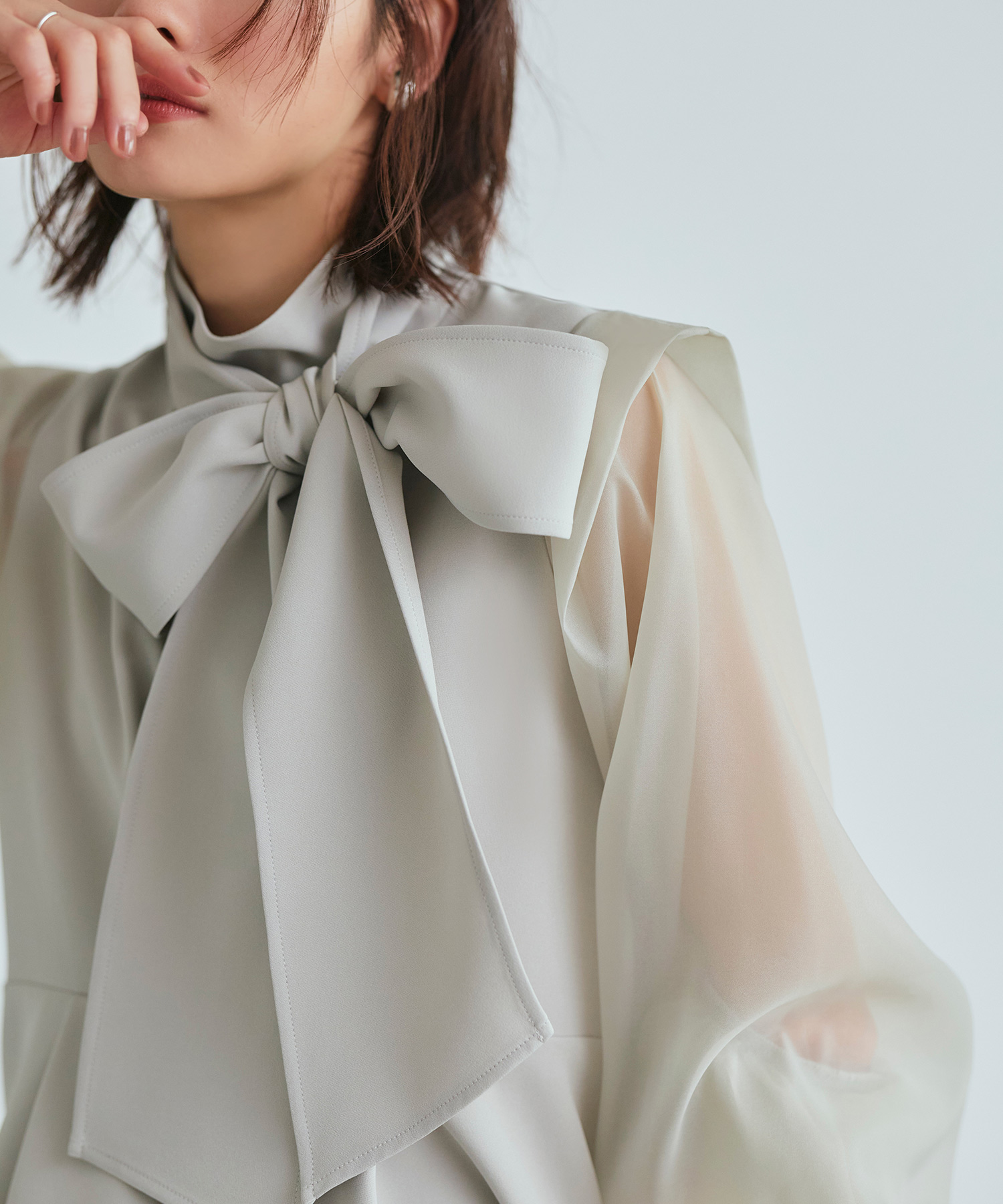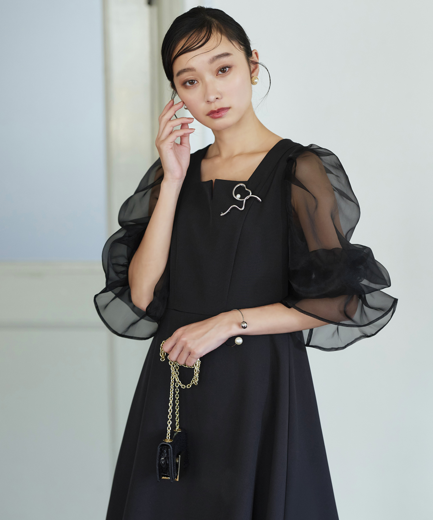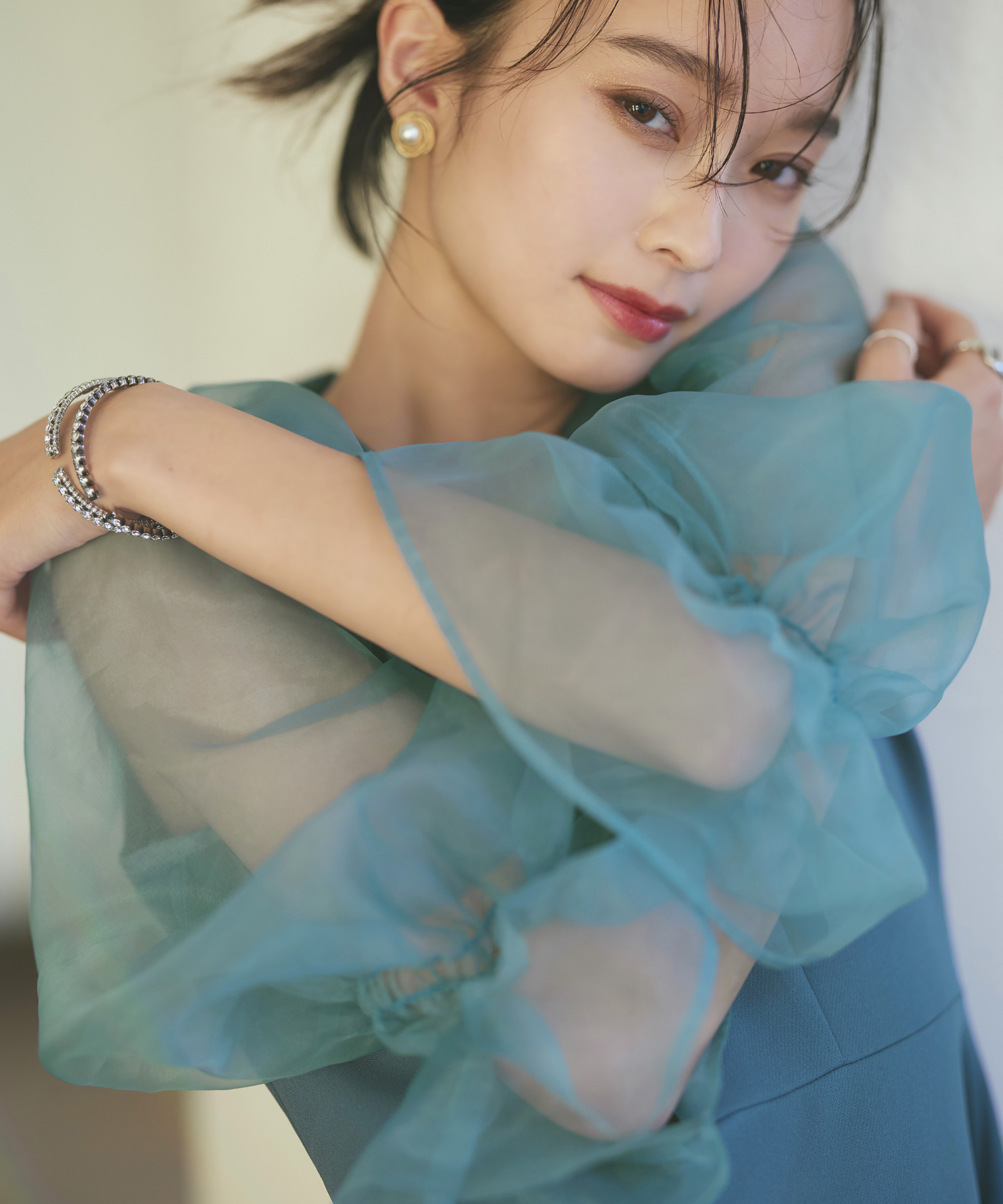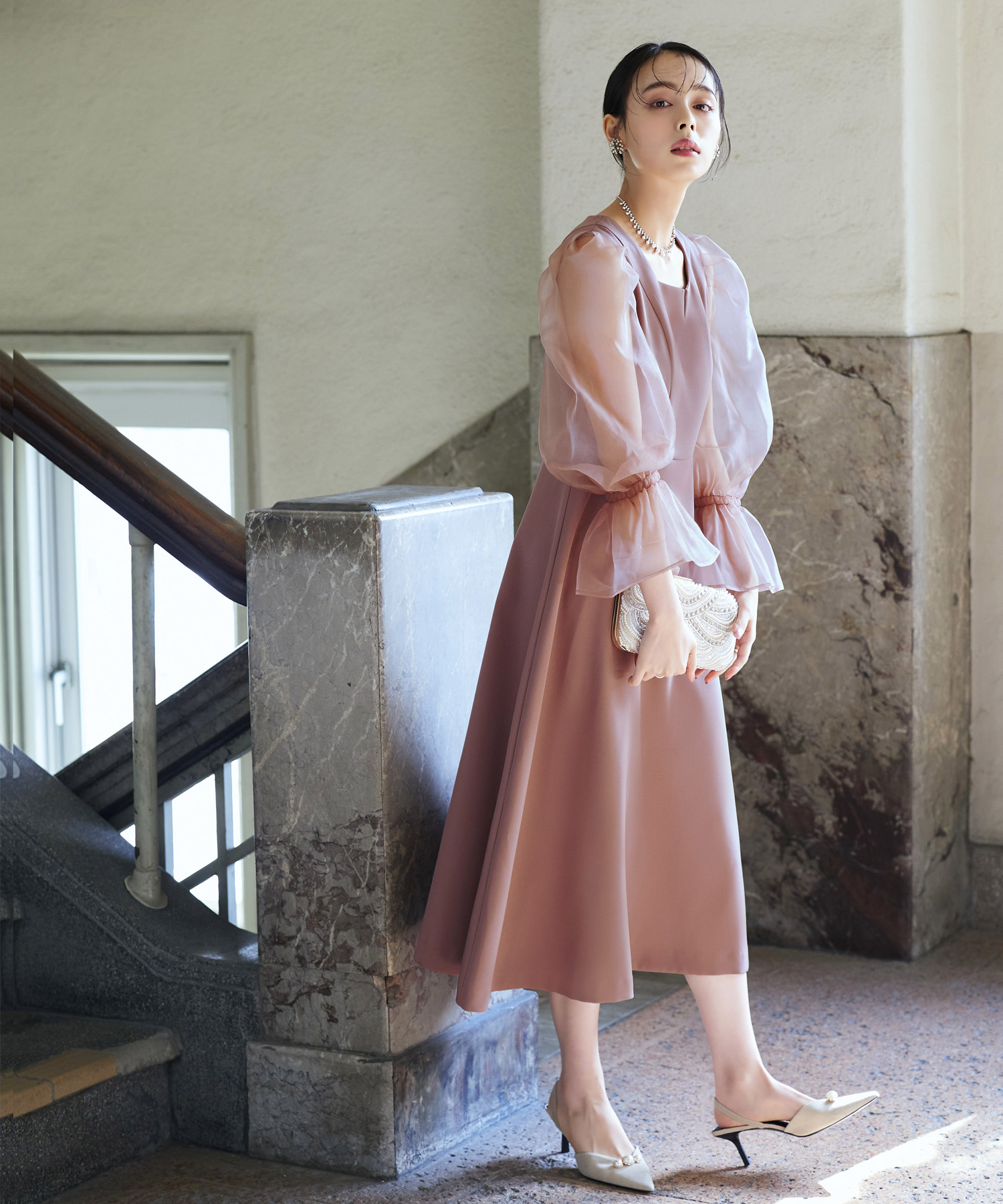 透け感と袖の立体感が映える上品なセットアップドレス。トップスの程よい透け感とボリュームスリーブが優雅な印象を与え、ドレスのしなやかなシルエットが女性らしさを引き立ててくれます。