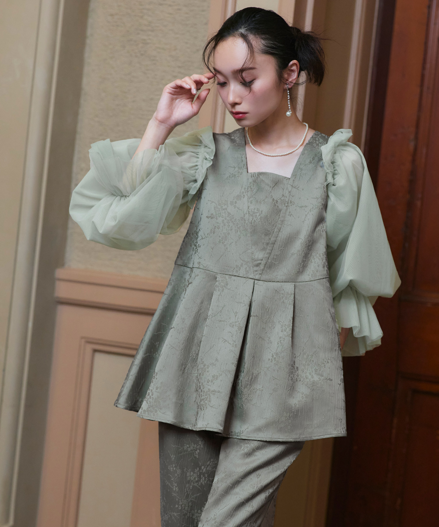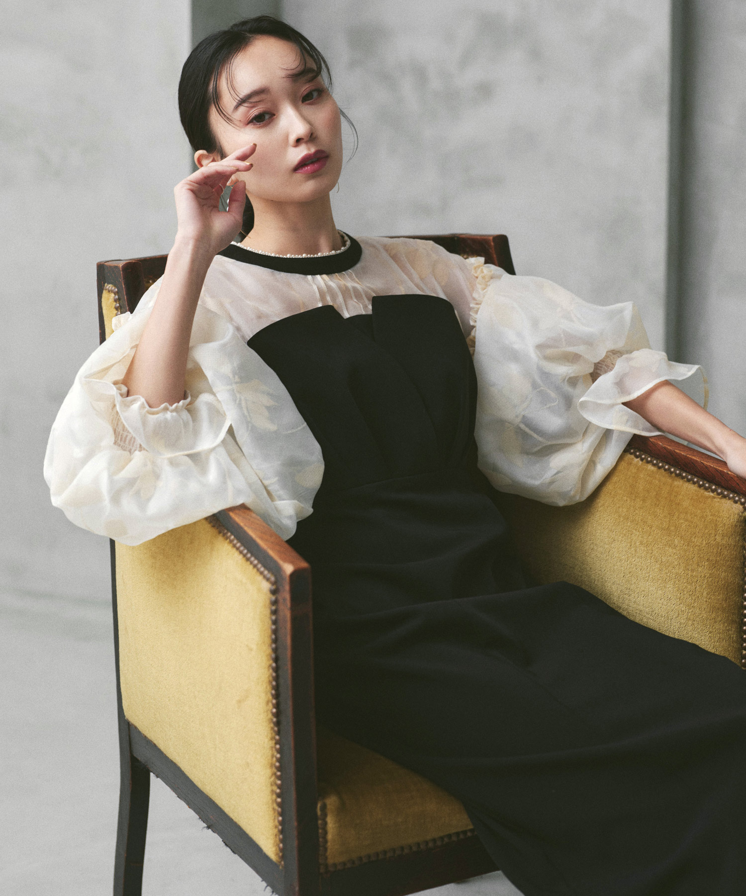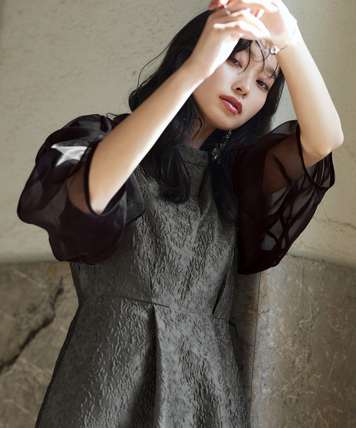 ジャカード織り特有の上質な質感と、クラシックな印象のデザインが相まり、纏う人の女性性を引き出す一着。ランタンスリーブや鎖骨の切替部分に、上品な透け感のあるオーガンジーを組み合わせて華やかさをプラス。