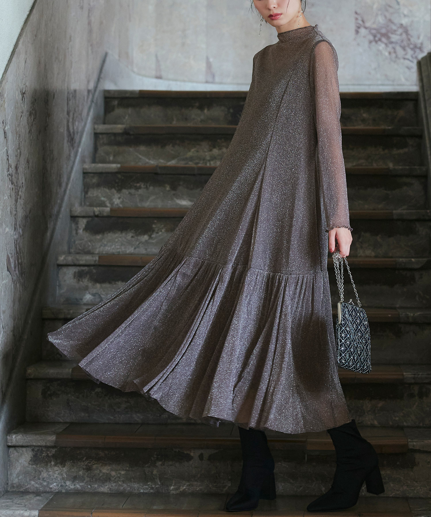 繊細な煌めきを纏ったラメチュールドレス。ハイネック&ロングスリーブがクラシカルなデザイン、Aラインの華やかなシルエットにバックパールが360度美しく見せてくれます。