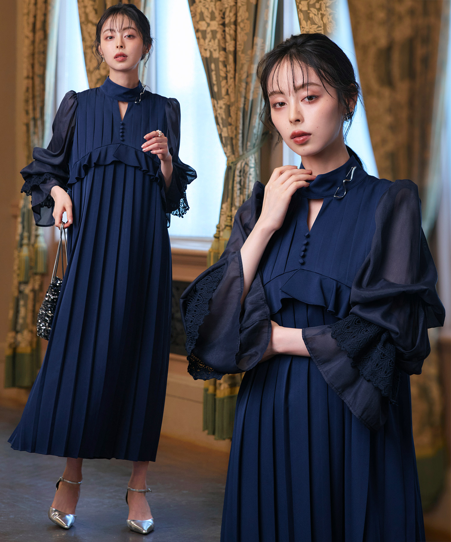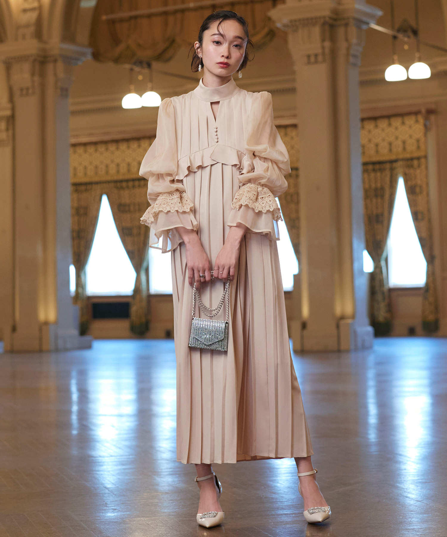上品なプリーツラインが縦のシルエットを美しく演出し、柔らかな印象を与えます。レトロ感とエレガンスを併せ持つ、特別な一日にぴったりの一着です。