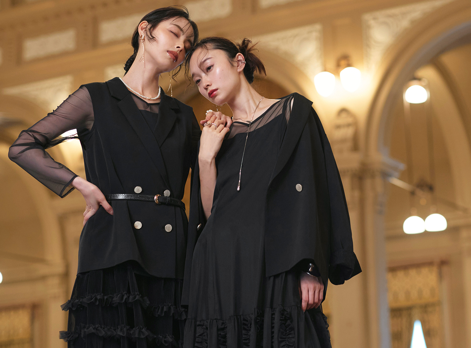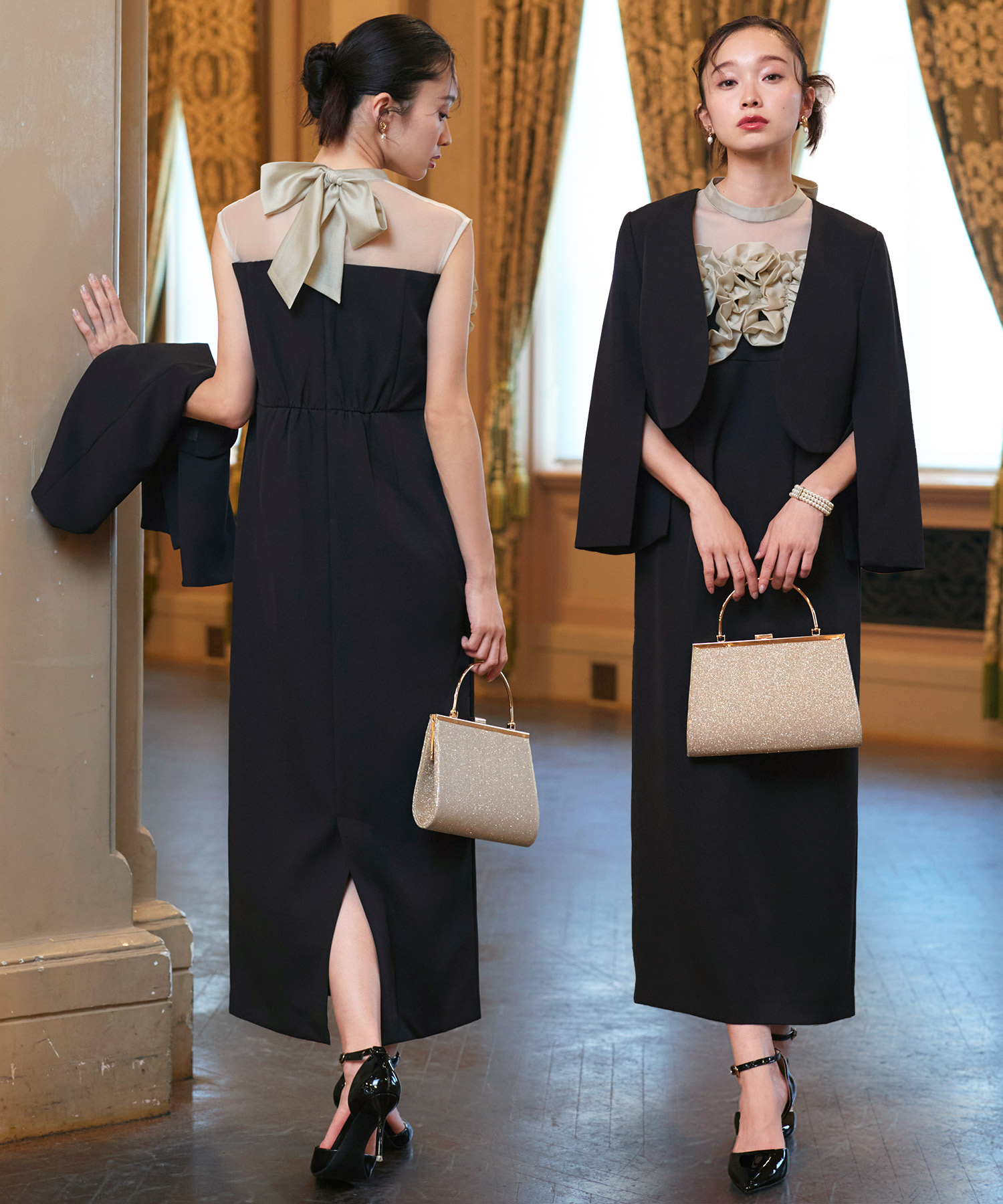 マルチに使えるボレロ&Iラインシルエットドレスのスタイリッシュなセットアップ。クチュール感のある立体的なフリルデザインとバックリボンがポイントのドレス。ボレロは袖口のスリットが着方の幅を広げてくれます。