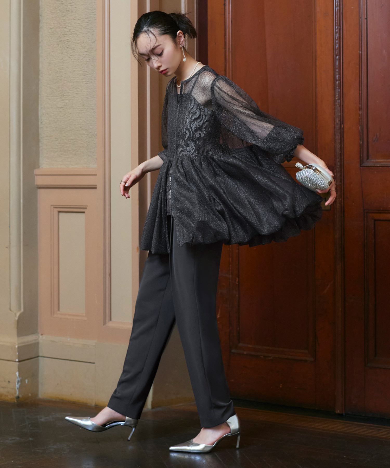 ヌーディーな抜け感を作る華やかで印象的なデザイン。体型をカバーする長めのペプラムトップスに、すっきりとしたストレートパンツを合わせて脚長効果を発揮。パーティーからフォーマルシーンまで幅広く活躍してくれるアイテムです。