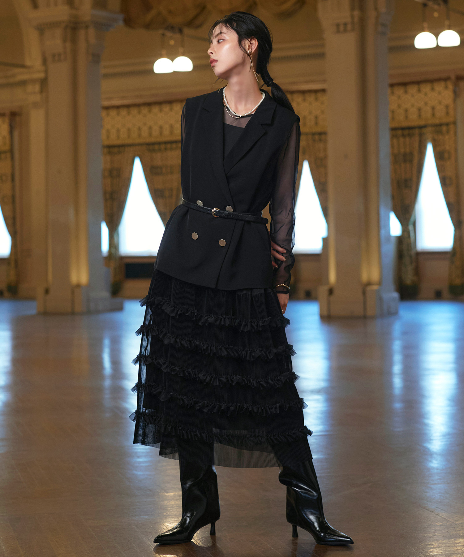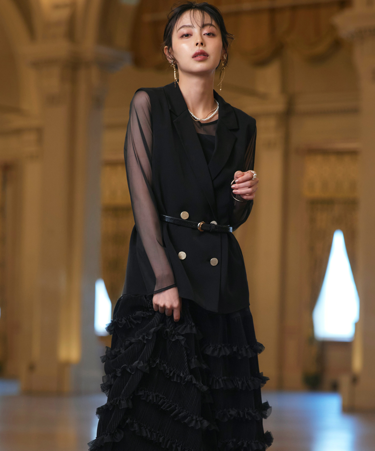 プリーツとフリルをあしらったデザインのワンピースとジレのセット。裾のプリーツとフリルが歩くたびに美しく揺れ動いてくれます。きれいめな素材のベーシックダブルジレ。金ボタンでパーティー感も演出。