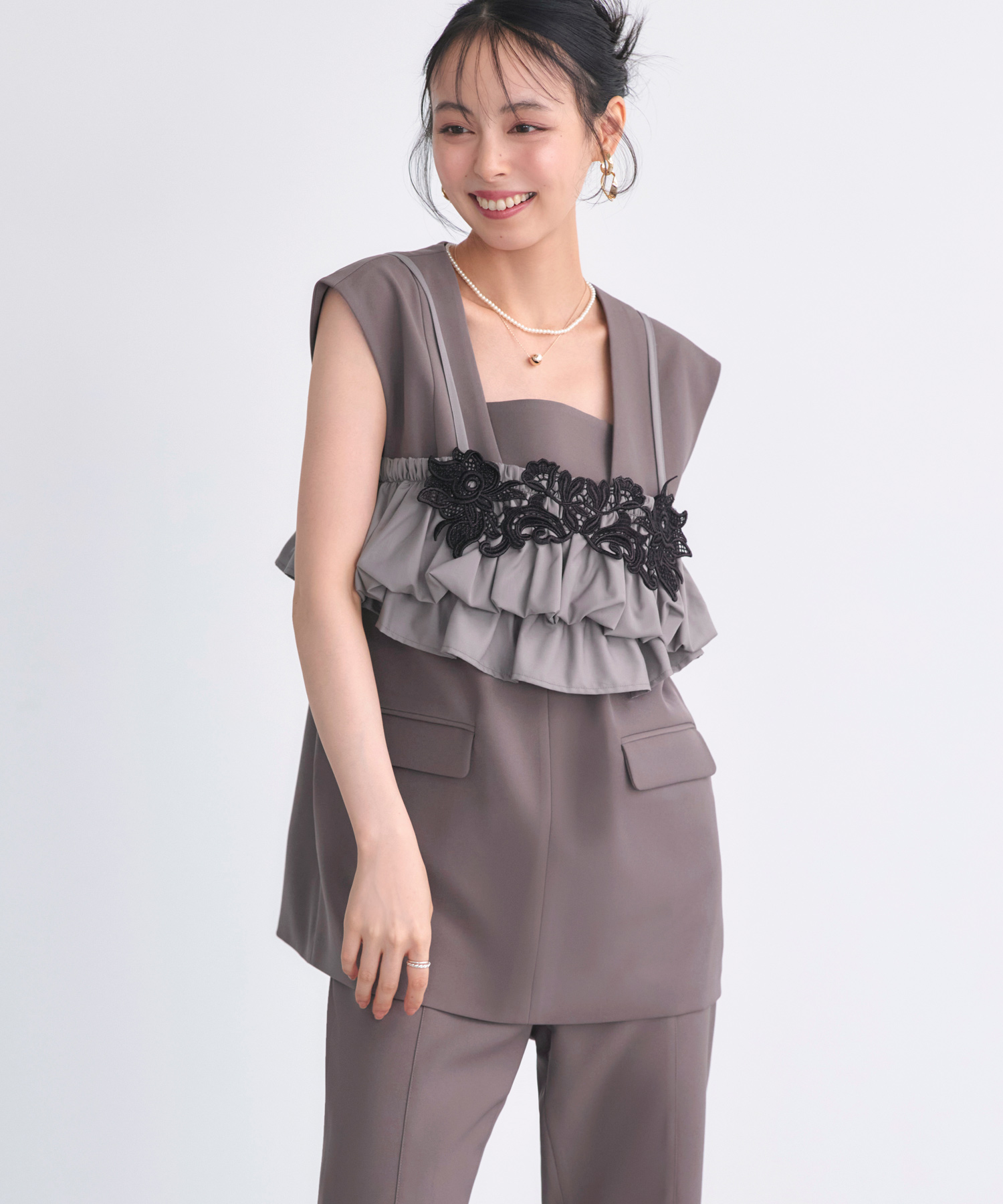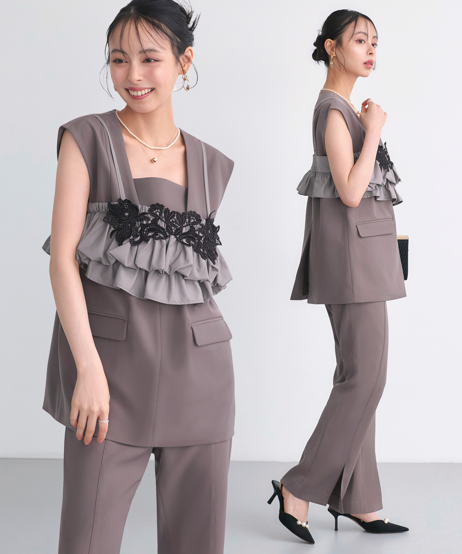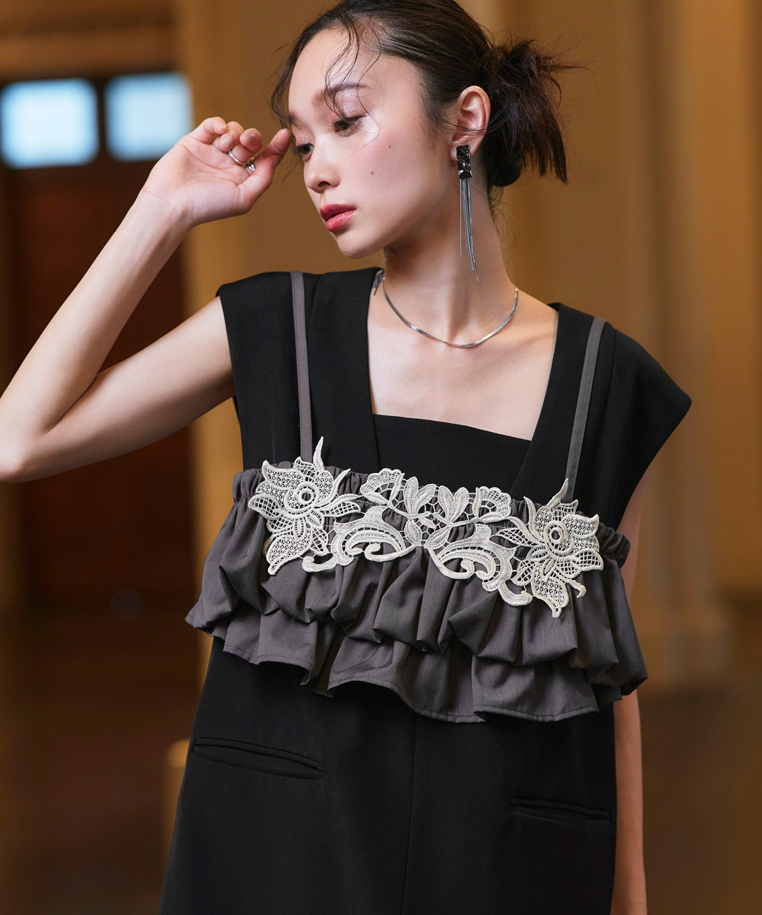 シーンに合わせてアレンジが可能な3ピースセットアップ。ベストの胸当てはボタンで取り外し可能。配色レースがポイントのビスチェは立体的な バルーンシルエットでコーデを華やかにしてくれます。