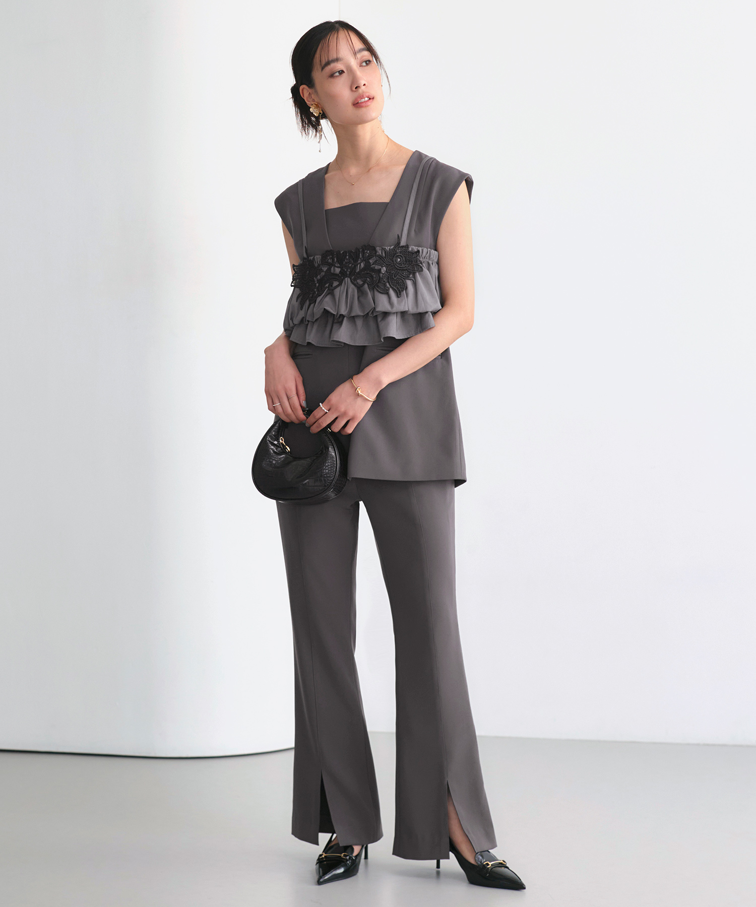エレガンスを携えた大人に似合う華やぎセットアップ。上品な表情の肌見せが叶う、ドッキング・トップスで抜け感のあるstyleに◎おなか周りスッキリ見えの2タック・セミワイドパンツと。