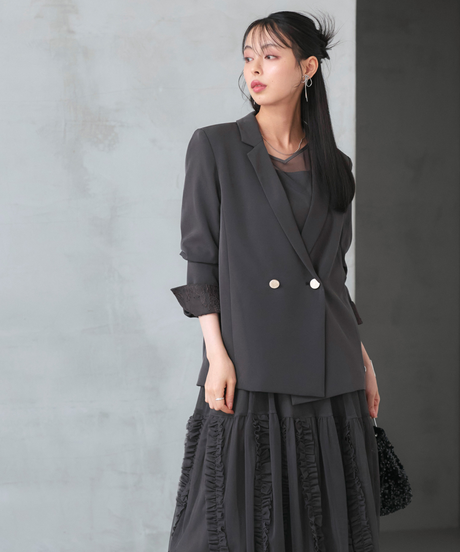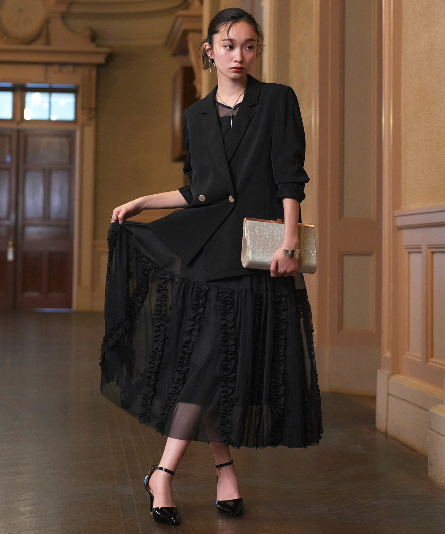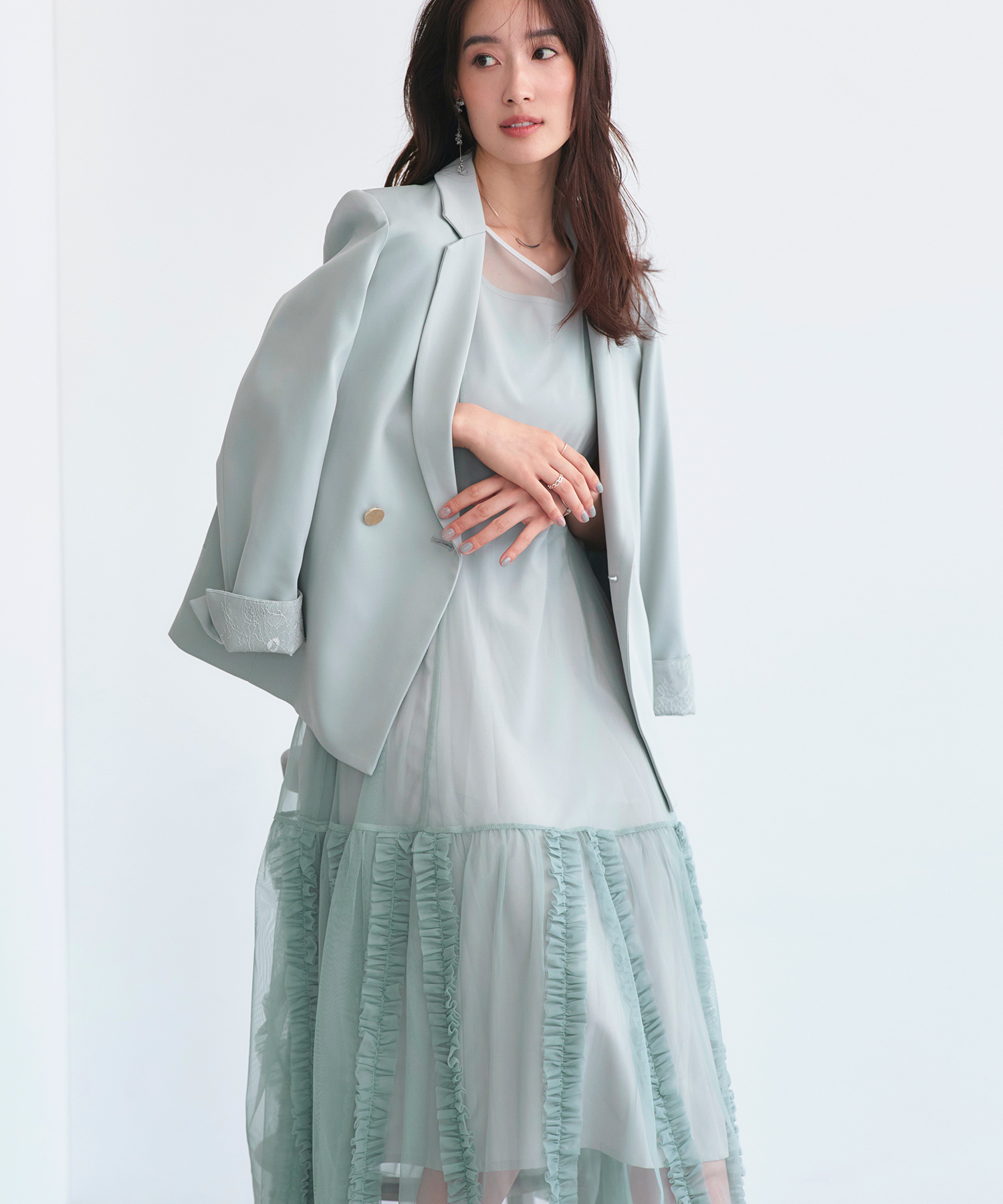 チュールフリルがポイントのワンピースとジャケットのセット。ワンピースは裾周りにボリュームを持たせた華やかなデザインで、パーティーやオケージョンシーンにおすすめです。