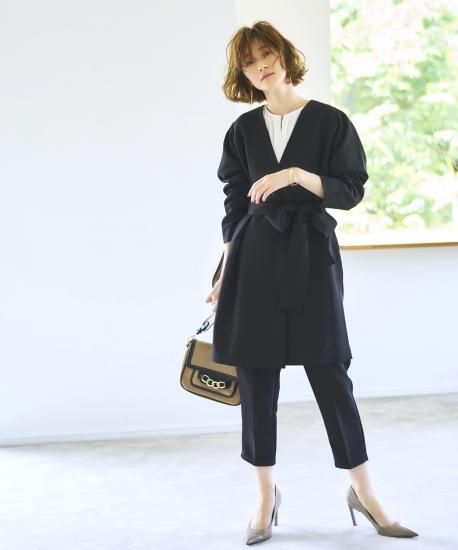 ジャケットを脱ぐ機会が多いオフィスコーデには、共布のリボンベルトをパンツに通した着こなしがおすすめ。