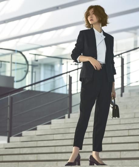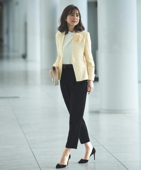 「きちんと感」と「華やかさ」を両立させたツイードジャケット、インナー&テーパードパンツの3点セットスーツ。