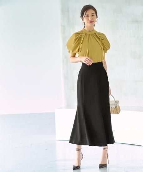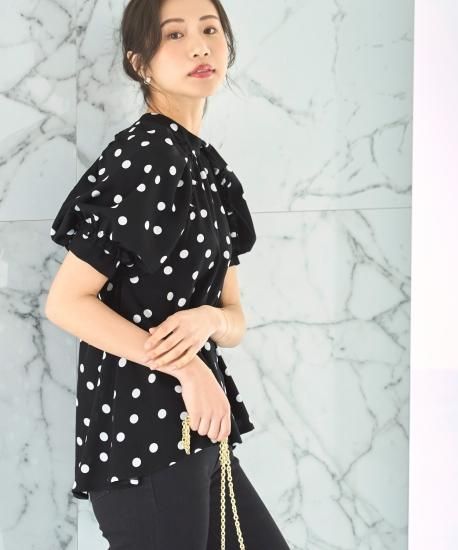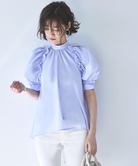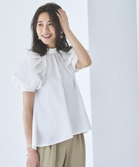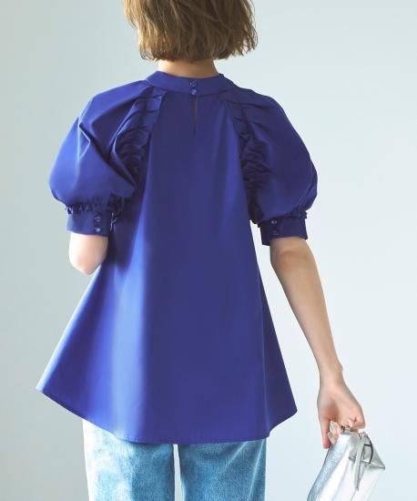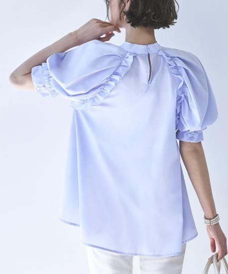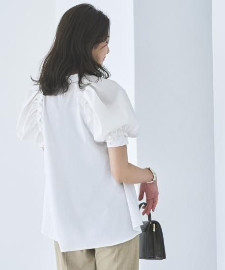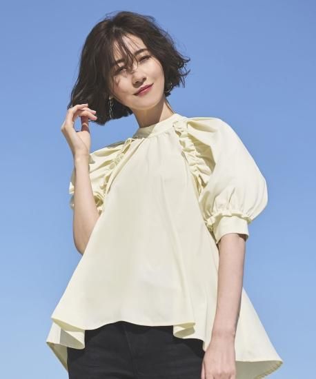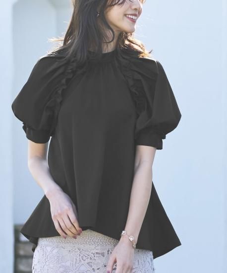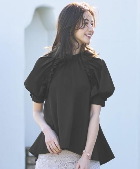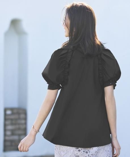 ショルダーラインと袖口に施したフリルがデザインのアクセントに。