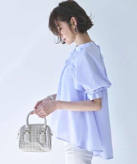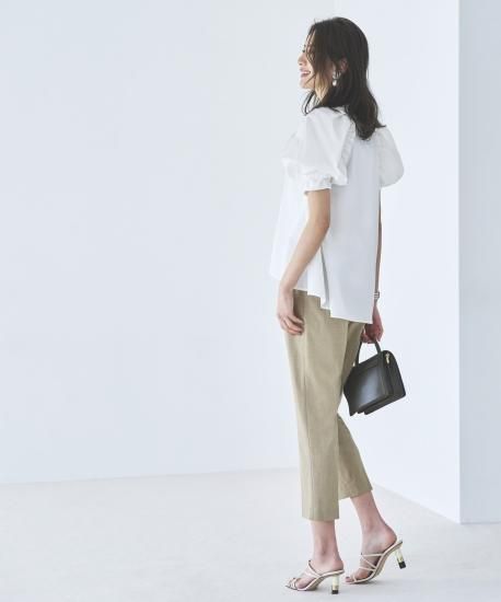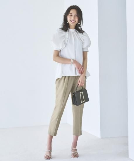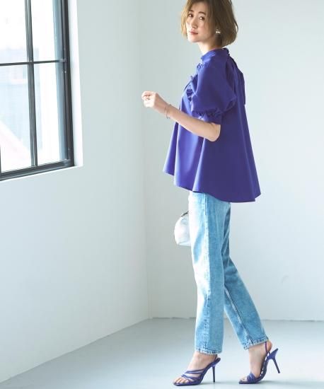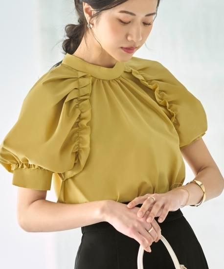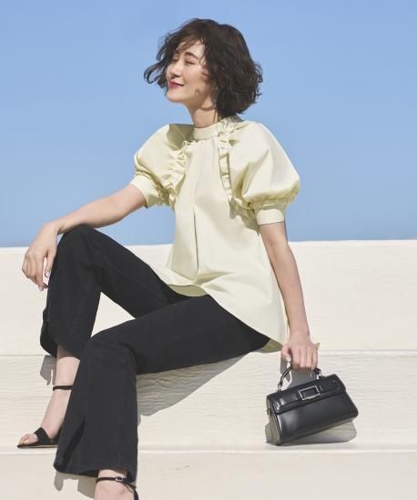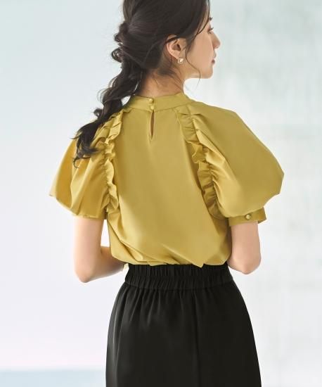 フェミニンさをプラスするフリルと、共色のボタンがデザインのアクセントに。