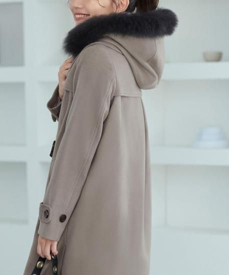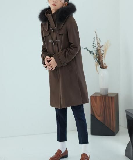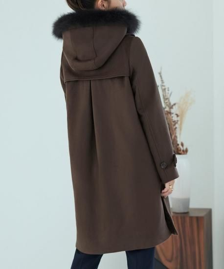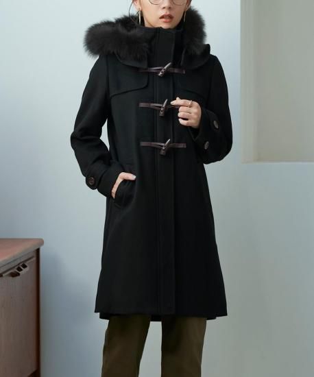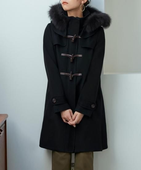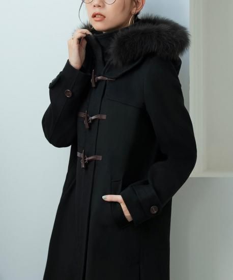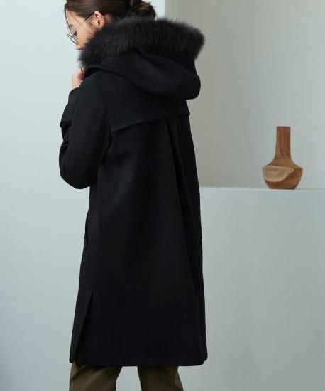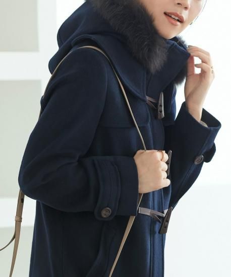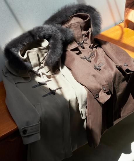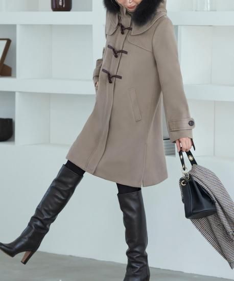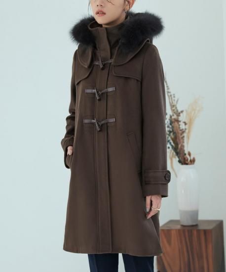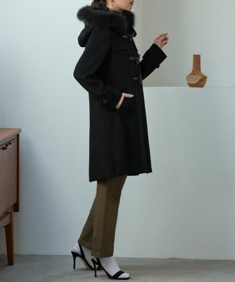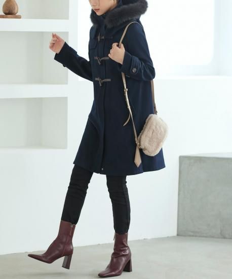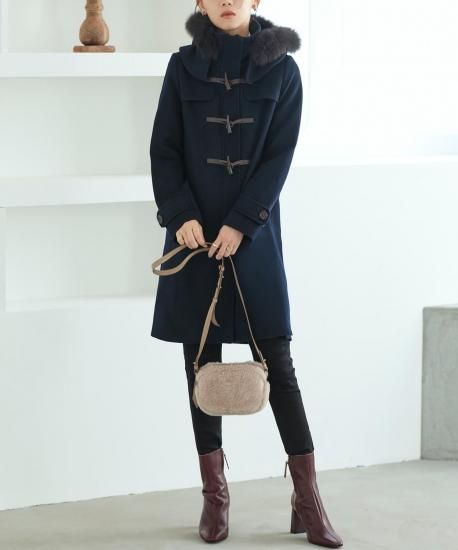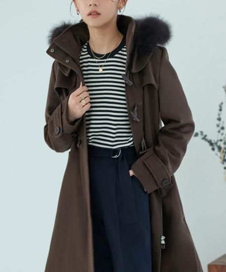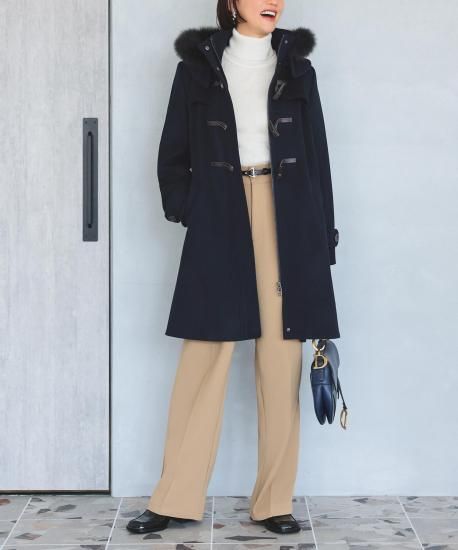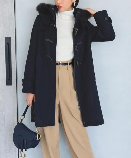 ふわふわしたファーで襟元を覆った、フェミニンでリュクスなカジュアルモードが漂うダッフルコート。