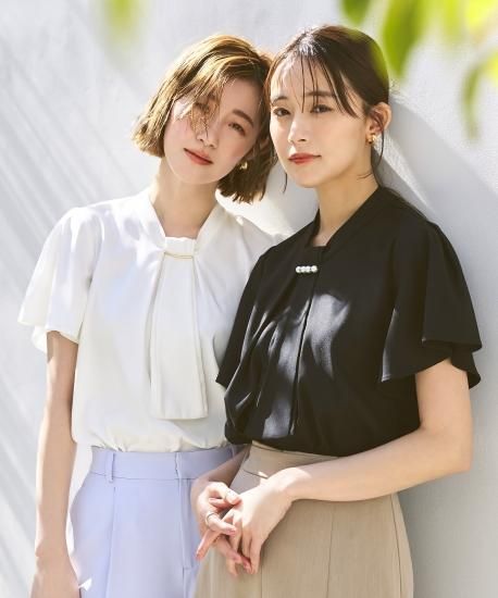 ボウタイのモチーフは、メタル風とパールの2素材、袖丈は長袖と半袖の2種類をご用意。