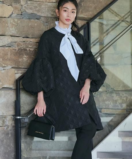 バックギャザーでたっぷりと量感のあるAラインシルエットと、トレンド感のある立体的なボリュームスリーブが華やかでラグジュアリーな印象を演出。