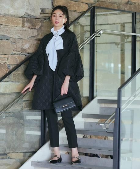 すっきりとしたノーカラーのコートは、ボリューミーなリボンタイブラウスも相性良くコーデが決まります。