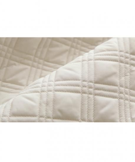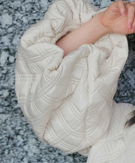 上品でしなやかなマットタフタ素材と軽く温かい機能性のある中綿に、スクエアデザインのキルティングをしています。