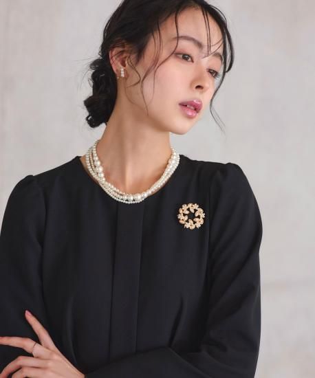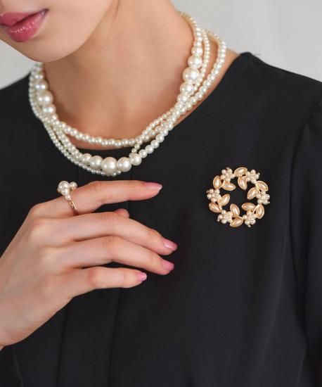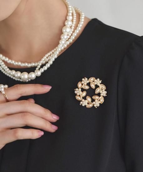 柔らかく艶めくパールサークルにビジューを3つ埋め込んだブローチ