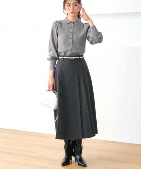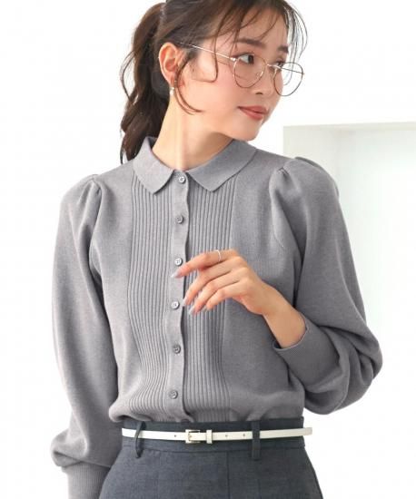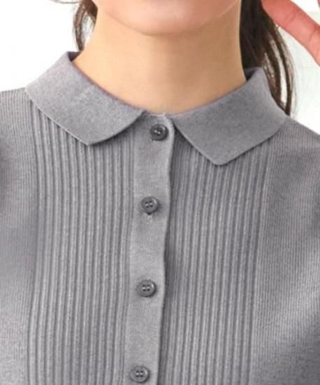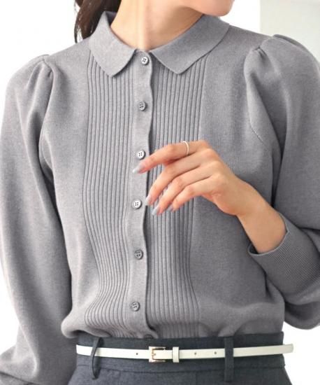 上品な衿とピンタック編みが縦ラインを強調し、すっきりとした印象に。