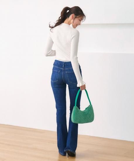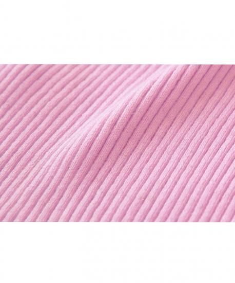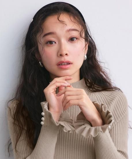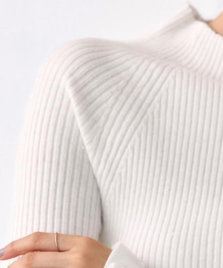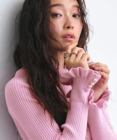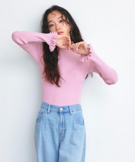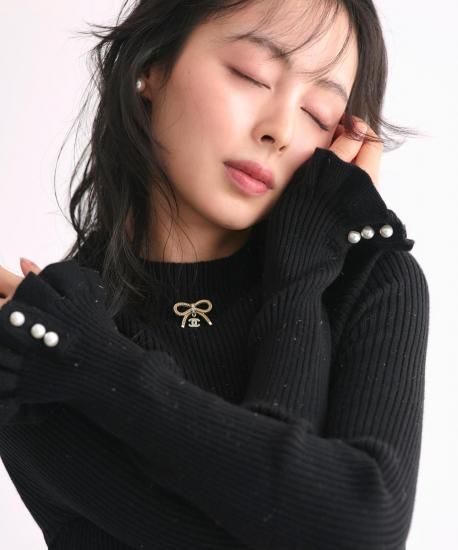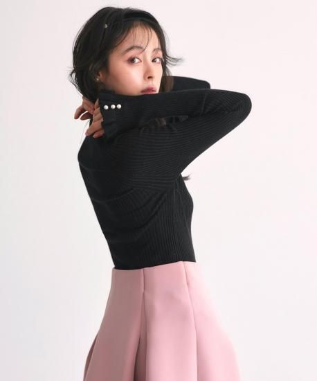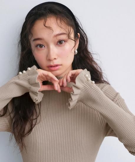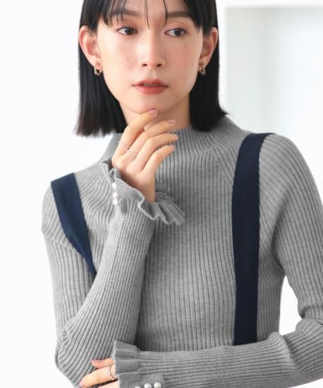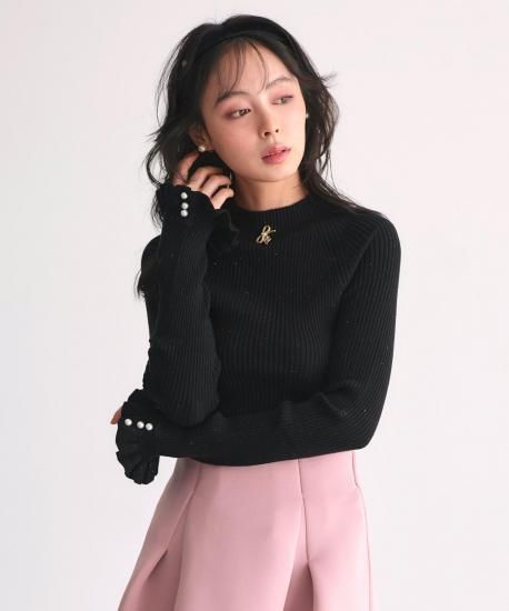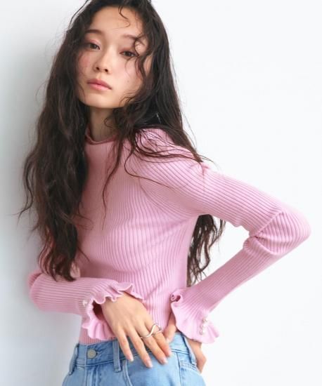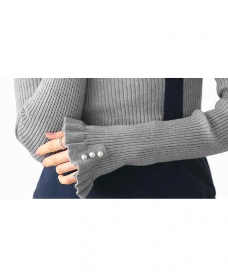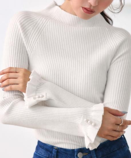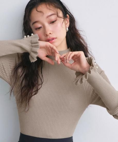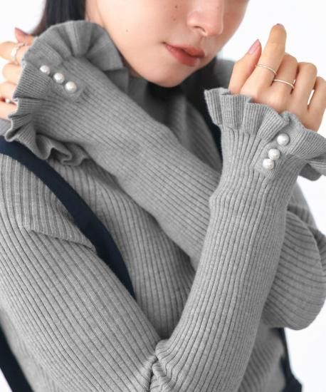 手元を華やかにみせるフリルとパールがポイントのリブ編みのニット。
