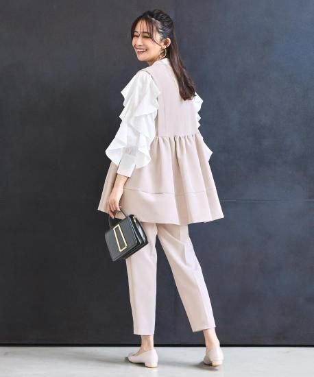 インパクトのあるボリュームがトレンド感のあるジレとフリルスリーブのシャツ、テーパードパンツの3点セット。
