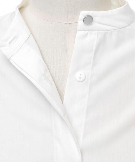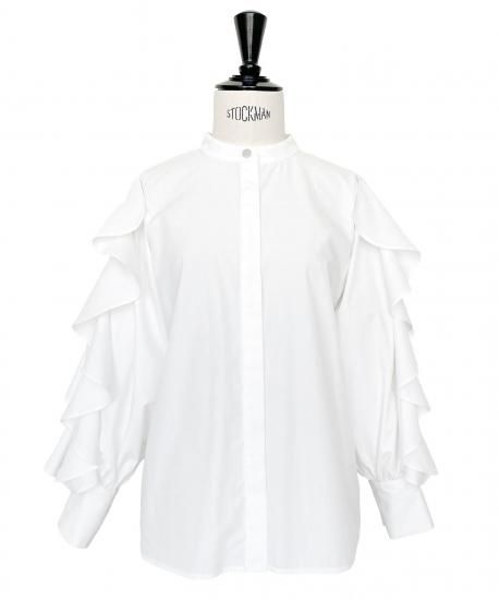 甘くなりすぎない袖のドレープフリルが特徴のシャツ。