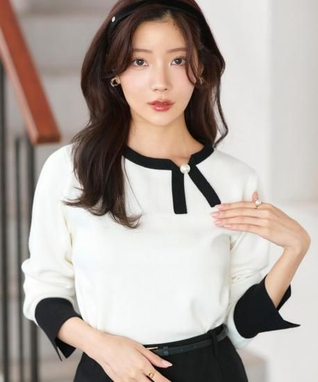 衿リボンとパールが顔まわりを華やかに見せ、女性らしい印象に。