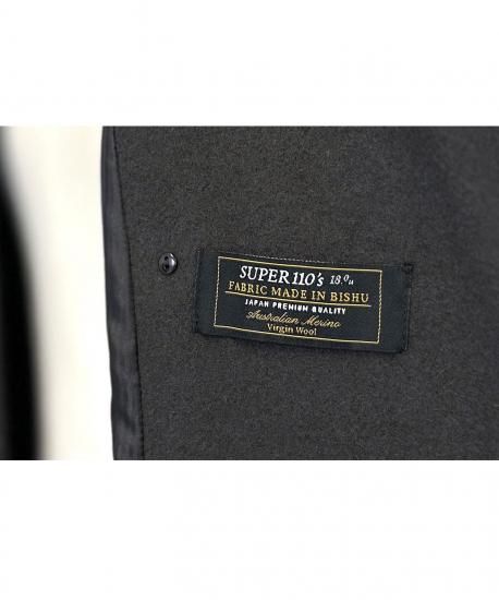 【Super110's】のオーストラリア産原料をベースに日本の尾州で仕上げた高級ウール素材です。生地の光沢、手触り、美しさなど上質な高級素材を使用しております。