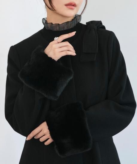 滑らかな質感のフェイクファーを袖口から覗かせてドレスアップ。