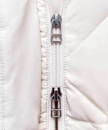 ◆伸縮性:なし ◆裏地:あり ◆開き具:前開きファスナー+ドット釦 3set ◆カラー:ブラック/エクリュ |