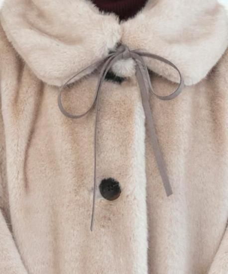 ボリュームのある襟元とスエードリボンで顔まわりを華やかに