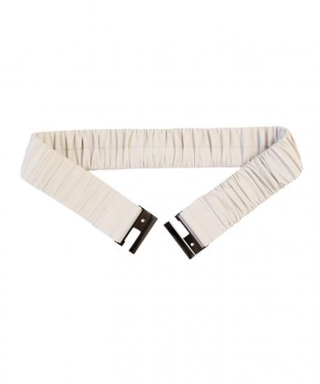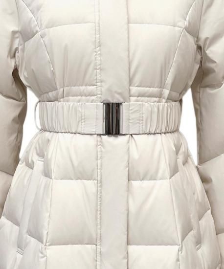 ウエストラインを美しく引き立てる共布ゴムベルトは、大人のエレガンスを演出。