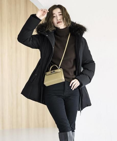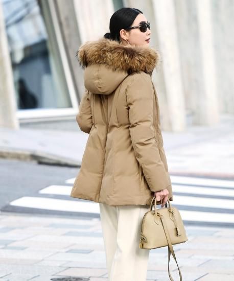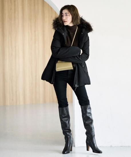 ステッチレスの滑らかな表情が洗練された印象を与え、たっぷりとしたラクーンファーが冬の装いを華やかに。