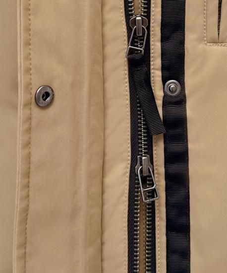 ◆伸縮性:なし ◆裏地:あり ◆開き具:前開きファスナー+ドット釦 6sets ◆付属品:ラクーンファー(釦+ゴムループで取り外し可) ◆カラー:ベージュ/ブラック |