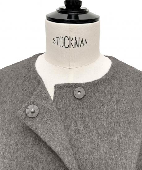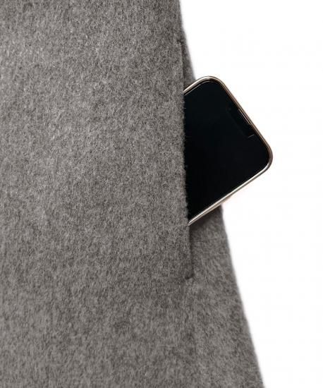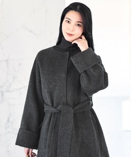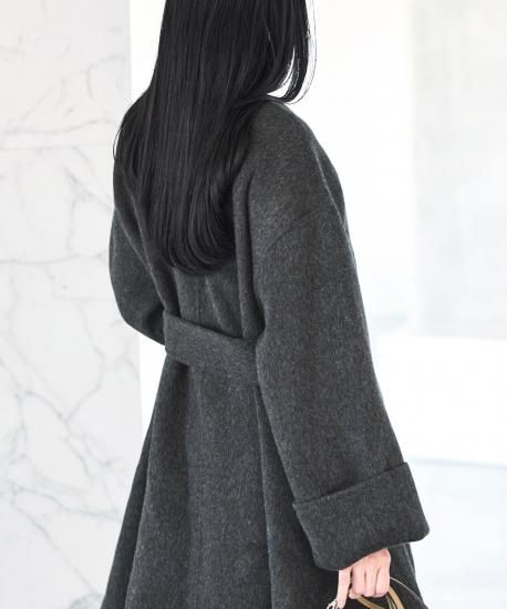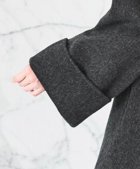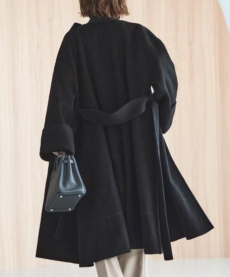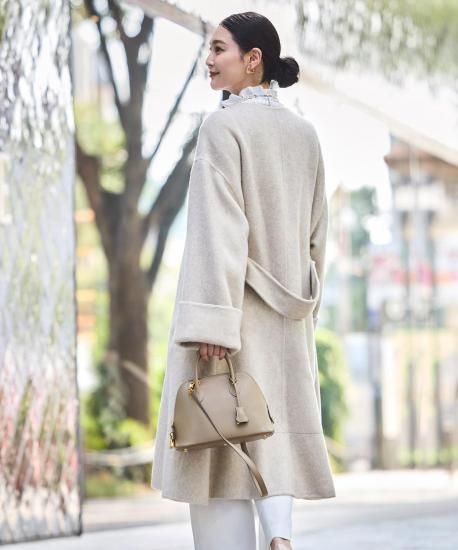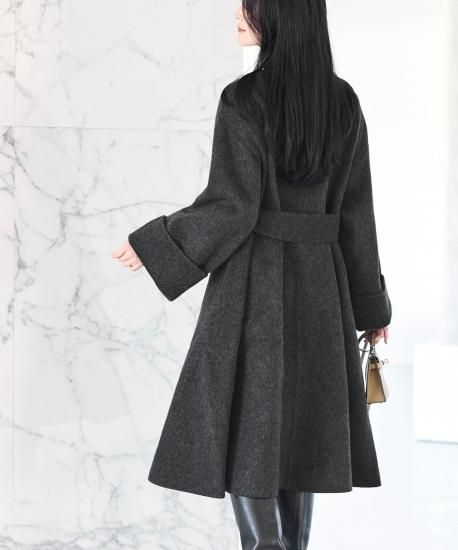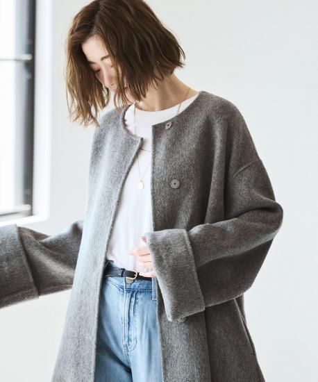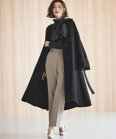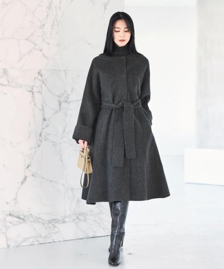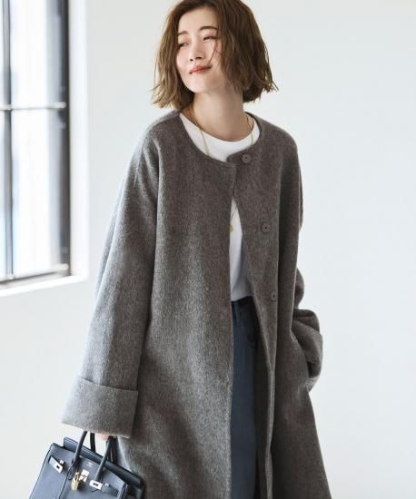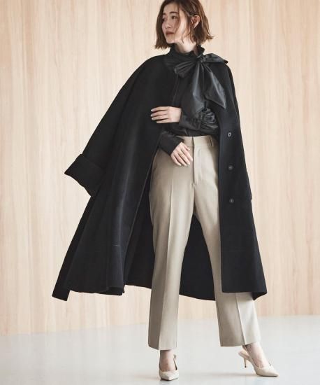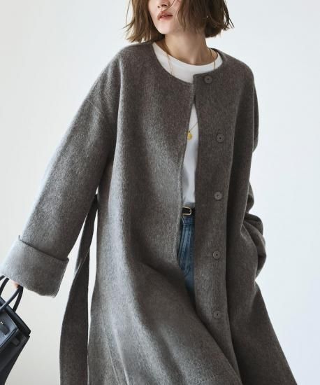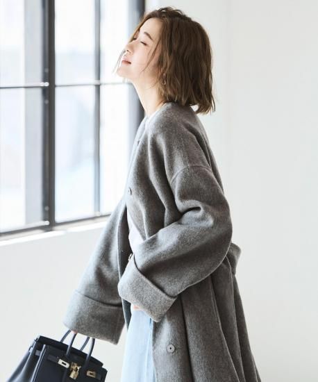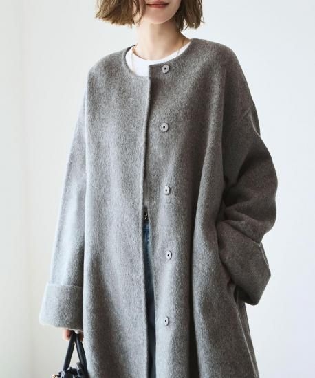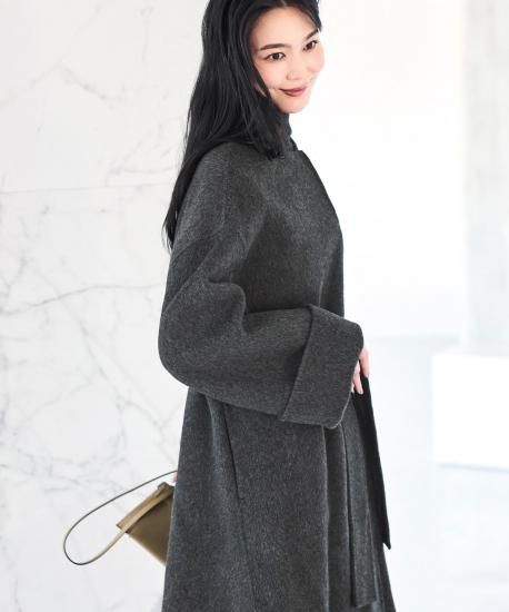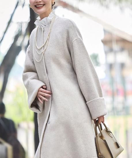 ウール100%ならではの上質な素材感を活かした、すっきりとしたノーカラーと美しいフレアシルエットが洗練された大人の雰囲気を演出。
