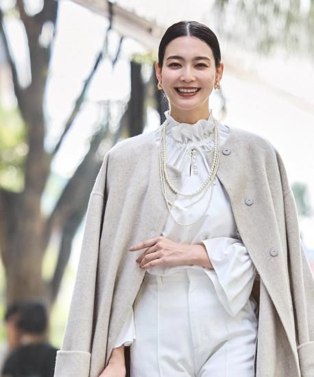 すっきりとしたノーカラーが顔まわりを上品に見せます。